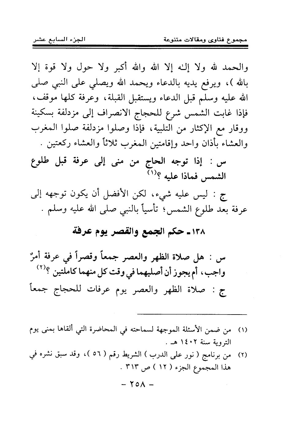 س: هل صلاة الظهر والعصر جمعا وقصرا في عرفة أمر واجب، أم يجوز أن أصليهما في وقت كل منهما كاملتين؟ (¬1)