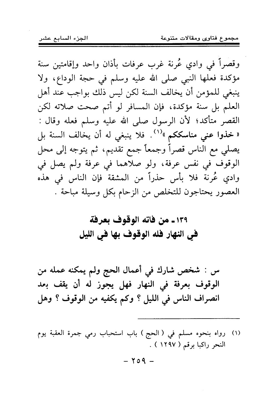 وقصرا في وادي عرنة غرب عرفات بأذان واحد وإقامتين سنة مؤكدة فعلها النبي صلى الله عليه وسلم في حجة الوداع، ولا ينبغي للمؤمن أن يخالف السنة لكن ليس ذلك بواجب عند أهل العلم بل سنة مؤكدة، فإن المسافر لو أتم صحت صلاته لكن القصر متأكدة؛ لأن الرسول صلى الله عليه وسلم فعله وقال: «خذوا عني مناسككم (¬1) » . فلا ينبغي له أن يخالف السنة بل يصلي مع الناس قصرا وجمعا جمع تقديم، ثم يتوجه إلى محل الوقوف في نفس عرفة، ولو صلاهما في عرفة ولم يصل في وادي عرنة فلا بأس حذرا من المشقة، فإن الناس في هذه العصور يحتاجون للتخلص من الزحام بكل وسيلة مباحة.