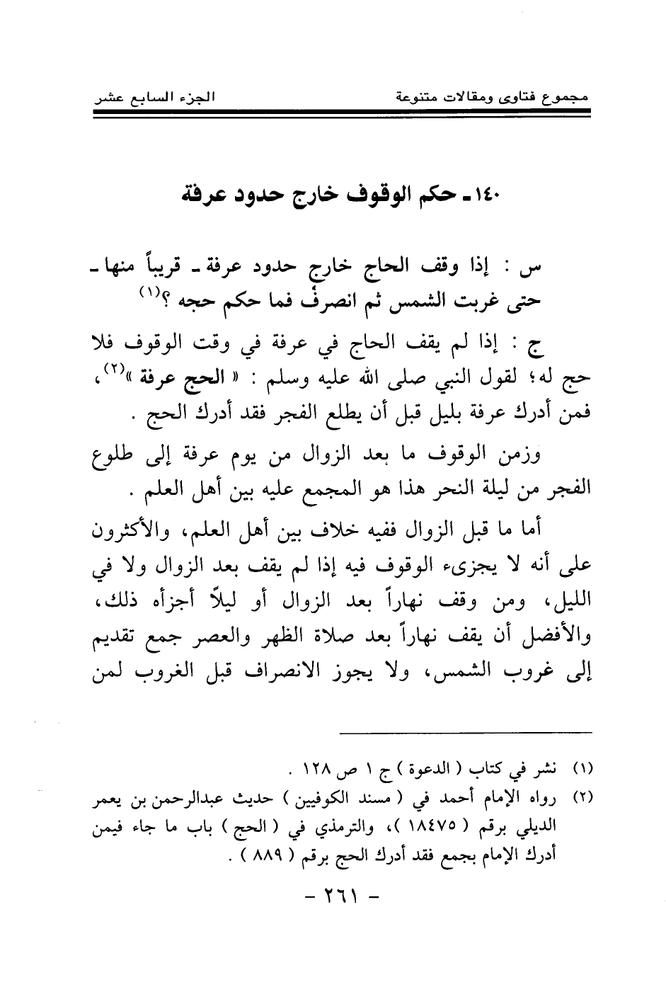 س: إذا وقف الحاج خارج حدود عرفة - قريبا منها - حتى غربت الشمس ثم انصرف فما حكم حجه؟ (¬1)