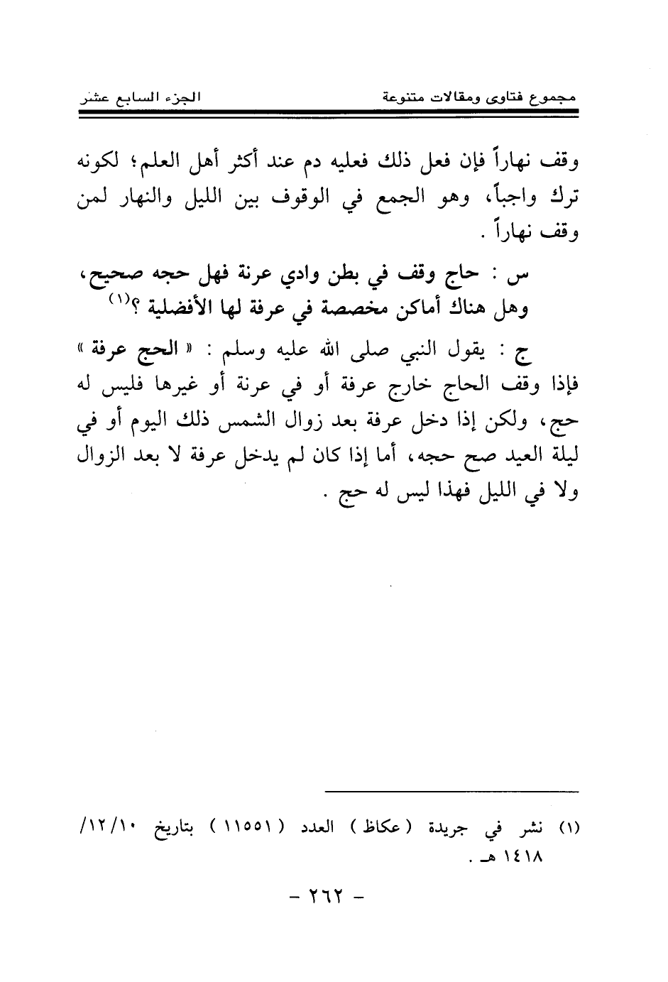 ج: يقول النبي صلى الله عليه وسلم: «الحج عرفة (¬2) » فإذا وقف الحاج خارج عرفة أو في عرنة أو غيرها فليس له حج، ولكن إذا دخل عرفة بعد زوال الشمس ذلك اليوم أو في ليلة العيد صح حجه، أما إذا كان لم يدخل عرفة لا بعد الزوال ولا في الليل فهذا ليس له حج.