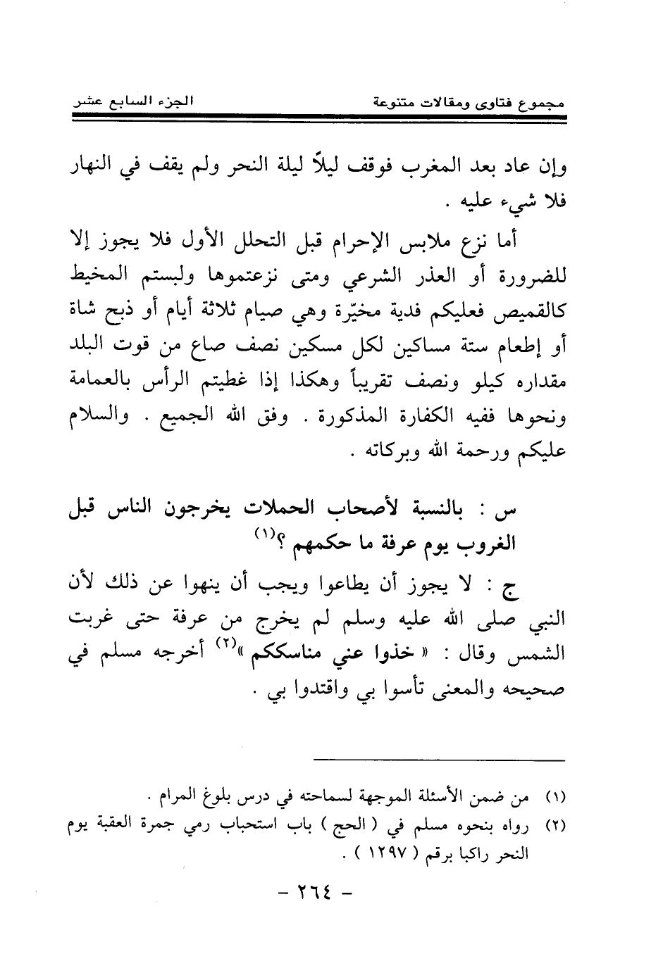 ج: لا يجوز أن يطاعوا ويجب أن ينهوا عن ذلك؛ لأن النبي صلى الله عليه وسلم لم يخرج من عرفة حتى غربت الشمس وقال: «خذوا عني مناسككم (¬2) » أخرجه مسلم في صحيحه والمعنى تأسوا بي واقتدوا بي.