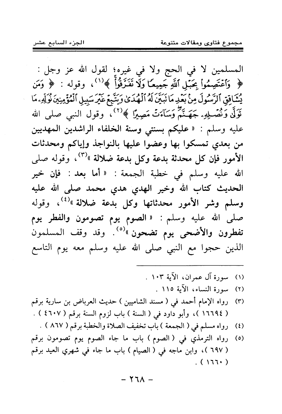 المسلمين، لا في الحج ولا في غيره؛ لقول الله عز وجل: {وَاعْتَصِمُوا بِحَبْلِ اللَّهِ جَمِيعًا وَلا تَفَرَّقُوا} (¬1) وقوله: {وَمَنْ يُشَاقِقِ الرَّسُولَ مِنْ بَعْدِ مَا تَبَيَّنَ لَهُ الْهُدَى وَيَتَّبِعْ غَيْرَ سَبِيلِ الْمُؤْمِنِينَ نُوَلِّهِ مَا تَوَلَّى وَنُصْلِهِ جَهَنَّمَ وَسَاءَتْ مَصِيرًا} (¬2) وقول النبي صلى الله عليه وسلم: «عليكم بسنتي وسنة الخلفاء الراشدين المهديين من بعدي تمسكوا بها وعضوا عليها بالنواجذ وإياكم ومحدثات الأمور فإن كل محدثة بدعة وكل بدعة ضلالة (¬3) » ، وقوله صلى الله عليه وسلم، في خطبة الجمعة: «أما بعد فإن خير الحديث كتاب الله وخير الهدي هدي محمد صلى الله عليه وسلم وشر الأمور محدثاتها وكل بدعة ضلالة (¬4) » ، وقوله صلى الله عليه وسلم: «الصوم يوم تصومون والفطر يوم تفطرون والأضحى يوم تضحون (¬5) » .