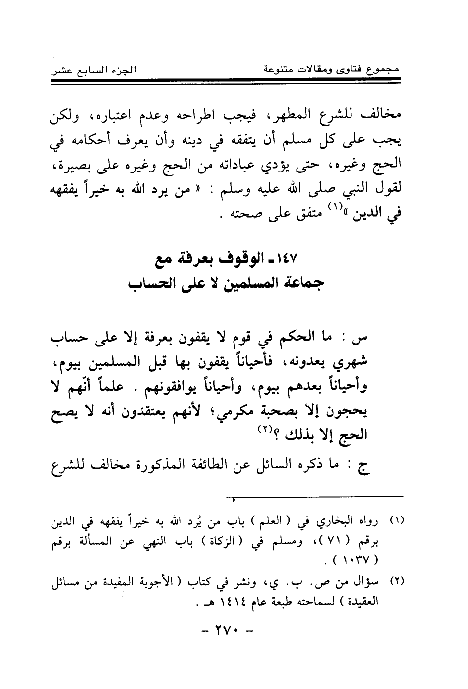 147 - الوقوف بعرفة مع جماعة المسلمين لا على الحساب س: ما الحكم في قوم لا يقفون بعرفة إلا على حساب شهري يعدونه، فأحيانا يقفون بها قبل المسلمين بيوم، وأحيانا بعدهم بيوم، وأحيانا يوافقونهم. علما أنهم لا يحجون إلا بصحبة مكرمي؛ لأنهم يعتقدون أنه لا يصح الحج إلا بذلك؟ (¬2)