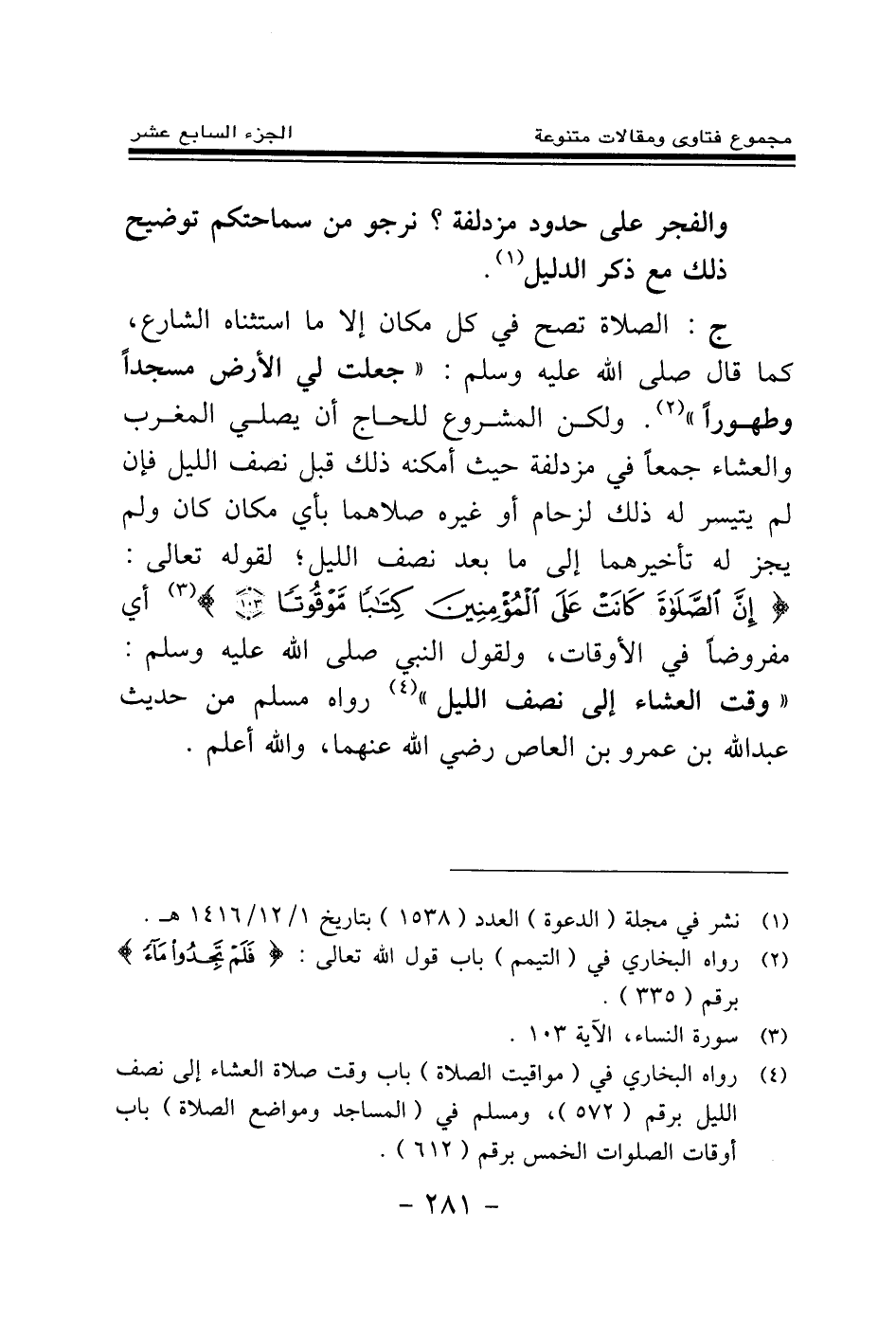 ج: الصلاة تصح في كل مكان إلا ما استثناه الشارع، كما قال صلى الله عليه وسلم: «جعلت لي الأرض مسجدا وطهورا (¬2) » ولكن المشروع للحاج أن يصلي المغرب والعشاء جمعا في مزدلفة حيث أمكنه ذلك قبل نصف الليل، فإن لم يتيسر له ذلك لزحام أو غيره صلاهما بأي مكان كان، ولم يجز له تأخيرهما إلى ما بعد نصف الليل؛ لقوله تعالى: {إِنَّ الصَّلَاةَ كَانَتْ عَلَى الْمُؤْمِنِينَ كِتَابًا مَوْقُوتًا} (¬3) أي مفروضا في الأوقات، ولقول النبي صلى الله عليه وسلم: «وقت العشاء إلى نصف الليل (¬4) » رواه مسلم من حديث عبد الله بن عمرو بن العاص رضي الله عنهما، والله أعلم.