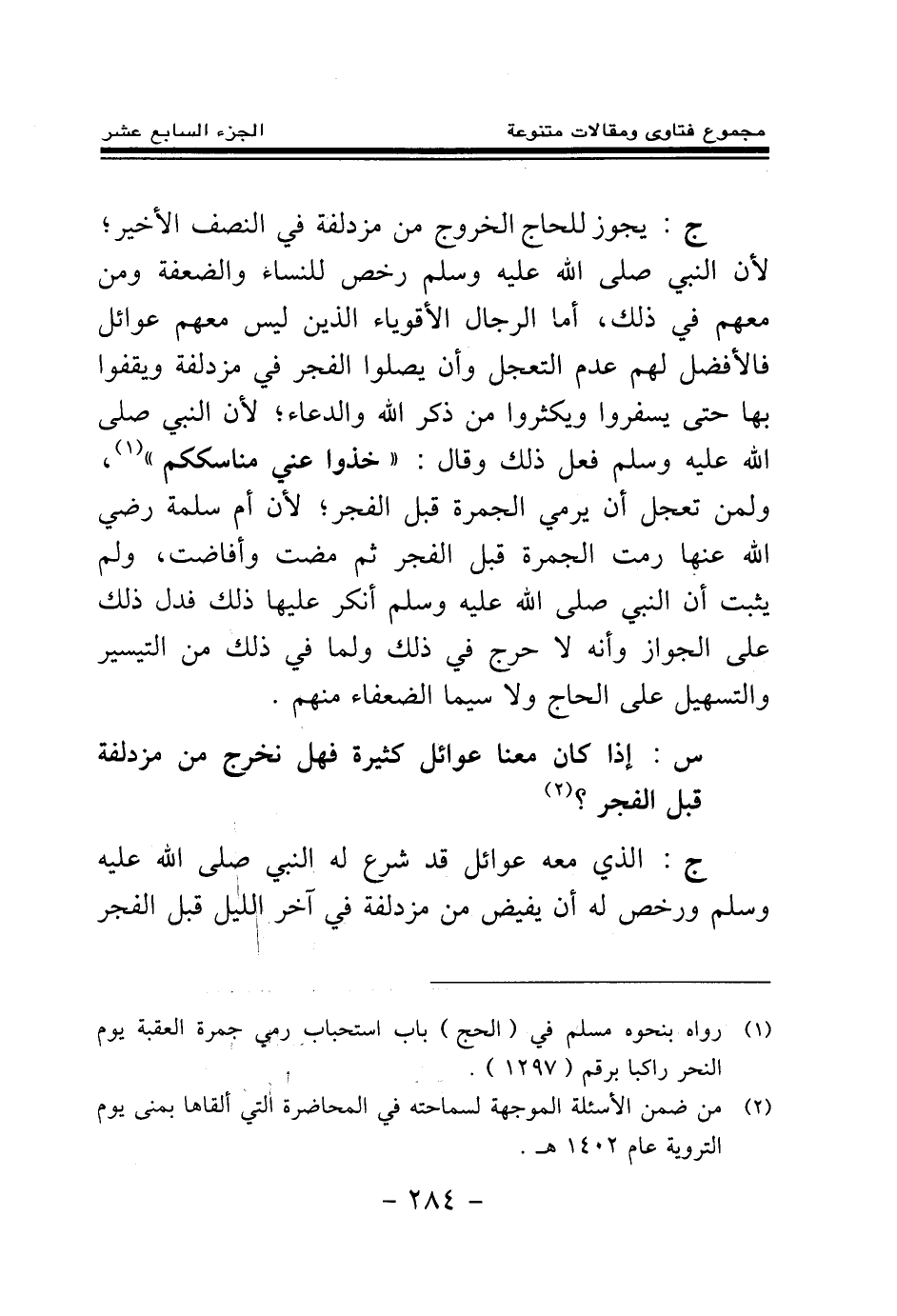 ج: يجوز للحاج الخروج من مزدلفة في النصف الأخير؛ لأن النبي صلى الله عليه وسلم رخص للنساء والضعفة ومن معهم في ذلك، أما الرجال الأقوياء الذين ليس معهم عوائل فالأفضل لهم عدم التعجل، وأن يصلوا الفجر في مزدلفة ويقفوا بها حتى يسفروا ويكثروا من ذكر الله والدعاء؛ لأن النبي صلى الله عليه وسلم فعل ذلك وقال: «خذوا عني مناسككم (¬1) » ، ولمن تعجل أن يرمي الجمرة قبل الفجر؛ لأن أم سلمة رضي الله عنها رمت الجمرة قبل الفجر ثم مضت وأفاضت، ولم يثبت أن النبي صلى الله عليه وسلم أنكر عليها ذلك، فدل ذلك على الجواز، وأنه لا حرج في ذلك، ولما في ذلك من التيسير والتسهيل على الحاج ولا سيما الضعفاء منهم.
