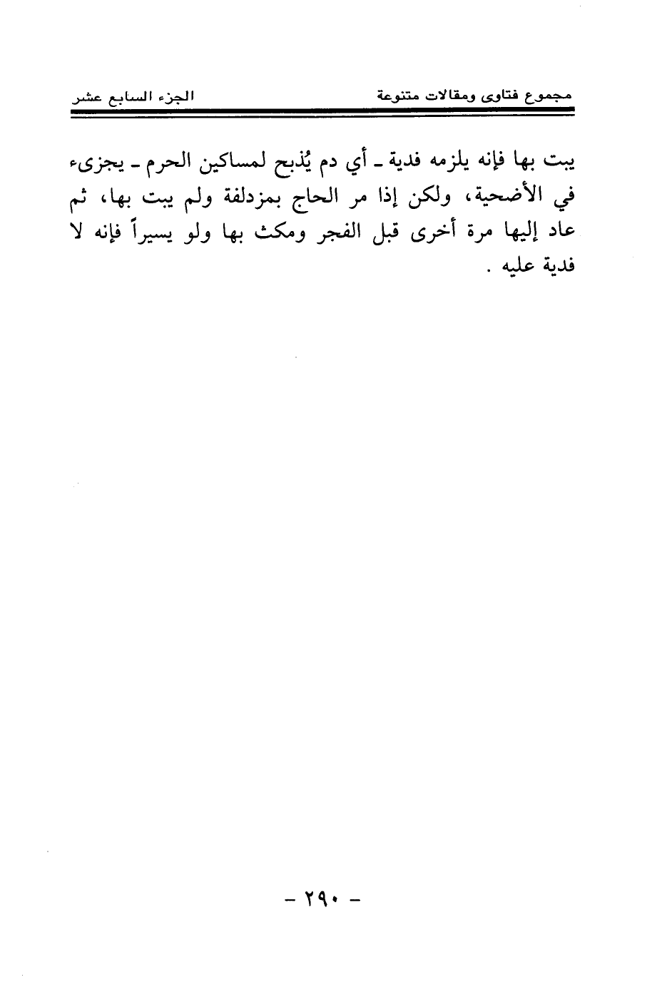 يبت بها فإنه يلزمه فدية - أي دم يذبح لمساكين الحرم - يجزئ في الأضحية، ولكن إذا مر الحاج بمزدلفة ولم يبت بها، ثم عاد إليها مرة أخرى قبل الفجر ومكث بها ولو يسيرا فإنه لا فدية عليه.
