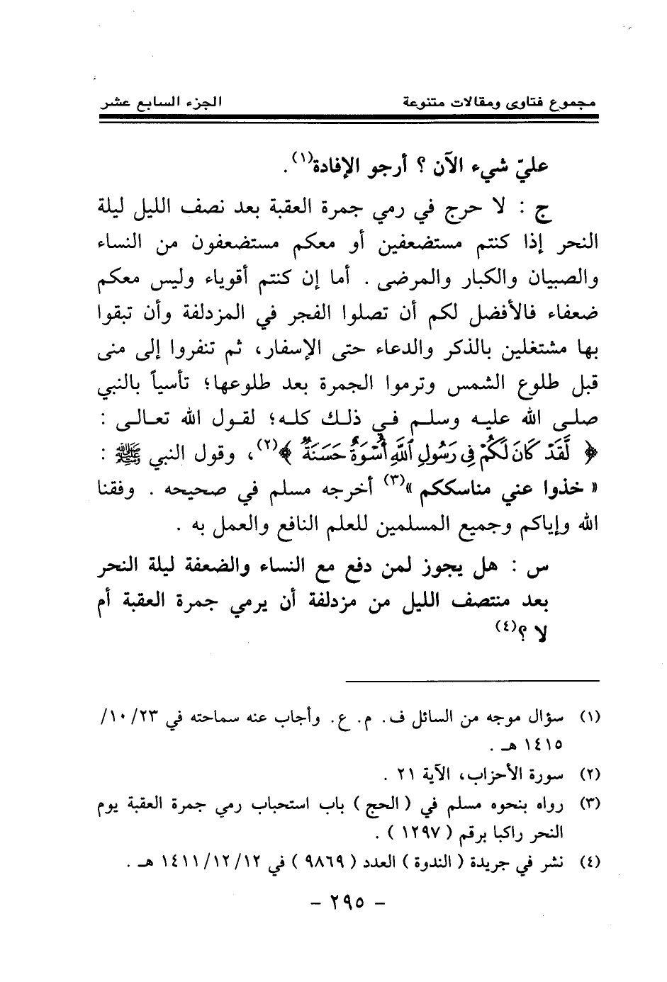 ج: لا حرج في رمي جمرة العقبة بعد نصف الليل ليلة النحر إذا كنتم مستضعفين أو معكم مستضعفون من النساء والصبيان والكبار والمرضى. أما إن كنتم أقوياء وليس معكم ضعفاء فالأفضل لكم أن تصلوا الفجر في المزدلفة وأن تبقوا بها مشتغلين بالذكر والدعاء حتى الإسفار، ثم تنفروا إلى منى قبل طلوع الشمس وترموا الجمرة بعد طلوعها؛ تأسيا بالنبي صلى الله عليه وسلم في ذلك كله؛ لقول الله تعالى: {لَقَدْ كَانَ لَكُمْ فِي رَسُولِ اللَّهِ أُسْوَةٌ حَسَنَةٌ} (¬2) وقول النبي صلى الله عليه وسلم: «خذوا عني مناسككم (¬3) » أخرجه مسلم في صحيحه. وفقنا الله وإياكم وجميع المسلمين للعلم النافع والعمل به.
