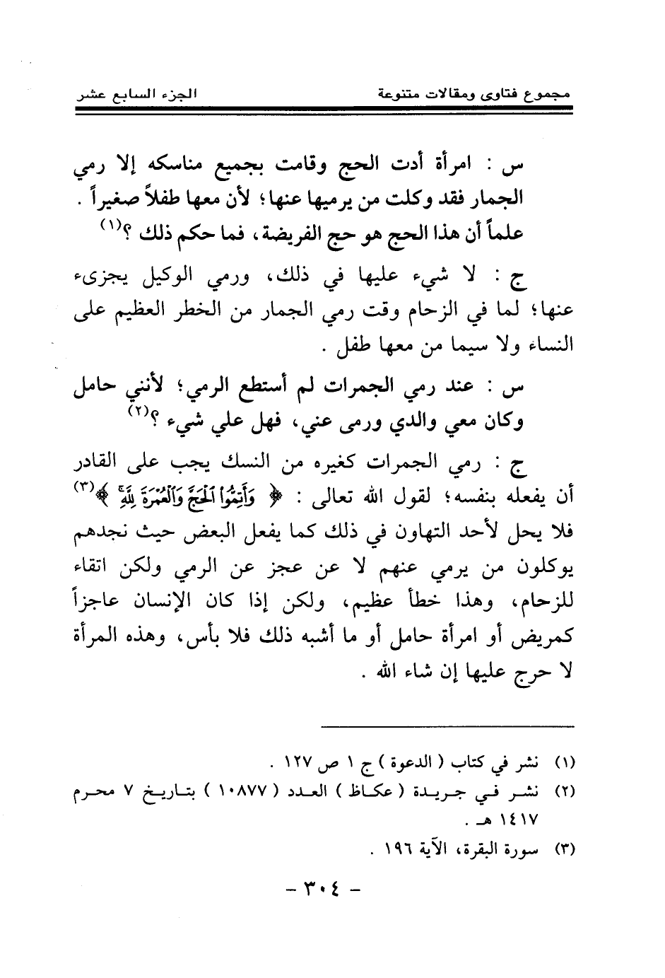 ج: رمي الجمرات كغيره من النسك يجب على القادر أن يفعله بنفسه؛ لقول الله تعالى: {وَأَتِمُّوا الْحَجَّ وَالْعُمْرَةَ لِلَّهِ} (¬2) فلا يحل لأحد التهاون في ذلك كما يفعل البعض حيث نجدهم يوكلون من يرمي عنهم لا عن عجز عن الرمي ولكن اتقاء للزحام، وهذا خطأ عظيم، ولكن إذا كان الإنسان عاجزا كمريض أو امرأة حامل أو ما أشبه ذلك فلا بأس، وهذه المرأة لا حرج عليها إن شاء الله.