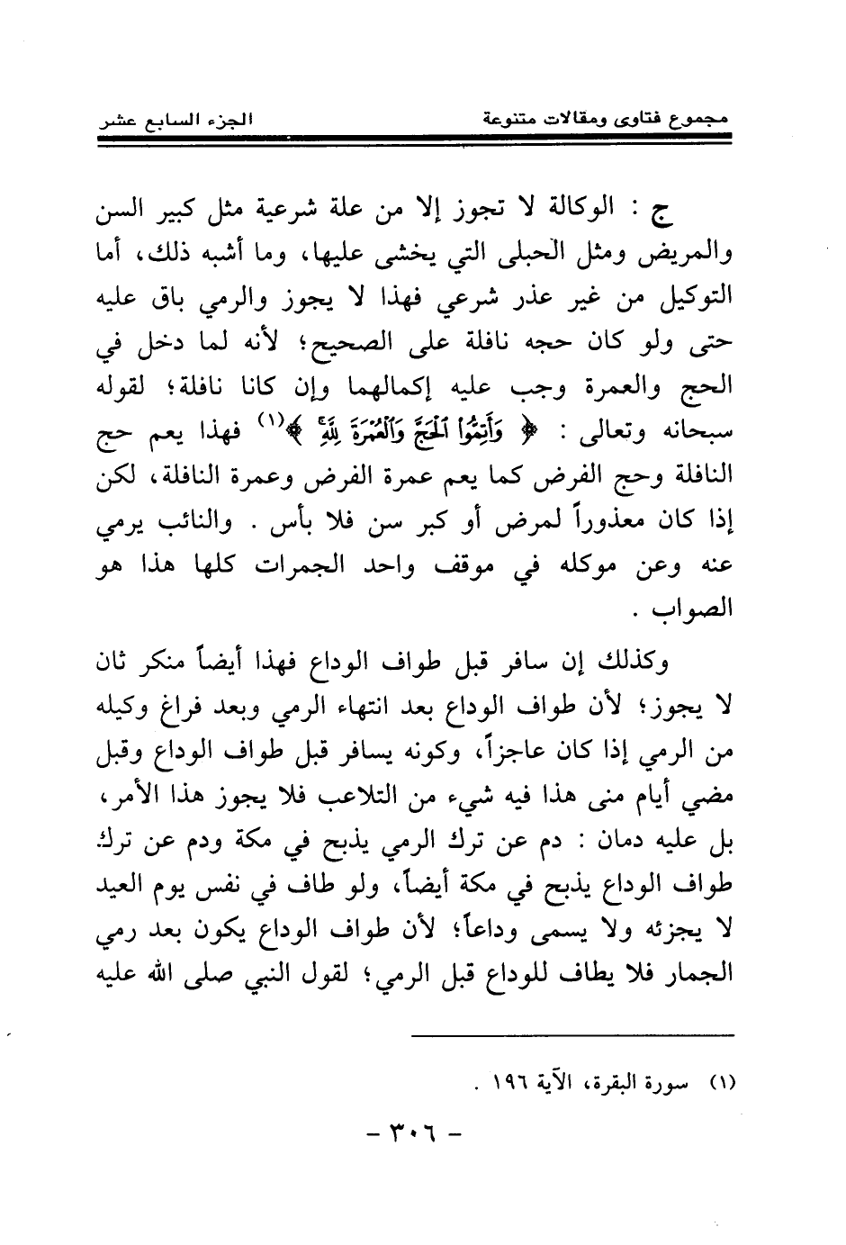 ج: الوكالة لا تجوز إلا من علة شرعية مثل كبير السن والمريض ومثل الحبلى التي يخشى عليها، وما أشبه ذلك، أما التوكيل من غير عذر شرعي فهذا لا يجوز والرمي باق عليه حتى ولو كان حجه نافلة على الصحيح؛ لأنه لما دخل في الحج والعمرة وجب عليه إكمالهما وإن كانا نافلة؛ لقوله سبحانه وتعالى: {وَأَتِمُّوا الْحَجَّ وَالْعُمْرَةَ لِلَّهِ} (¬1) فهذا يعم حج النافلة وحج الفرض كما يعم عمرة الفرض وعمرة النافلة، لكن إذا كان معذورا لمرض أو كبر سن فلا بأس. والنائب يرمي عنه وعن موكله في موقف واحد الجمرات كلها هذا هو الصواب.
