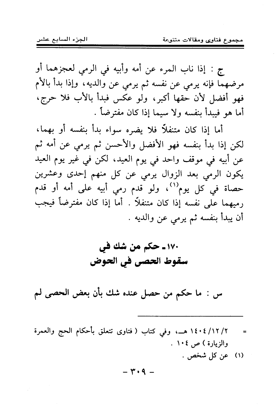 أما إذا كان متنفلا فلا يضره سواء بدأ بنفسه أو بهما، لكن إذا بدأ بنفسه فهو الأفضل والأحسن ثم يرمي عن أمه ثم عن أبيه في موقف واحد في يوم العيد، لكن في غير يوم العيد يكون الرمي بعد الزوال يرمي عن كل منهم إحدى وعشرين حصاة في كل يوم (¬1) ، ولو قدم رمي أبيه على أمه أو قدم رميهما على نفسه إذا كان متنفلا. أما إذا كان مفترضا فيجب أن يبدأ بنفسه ثم يرمي عن والديه.