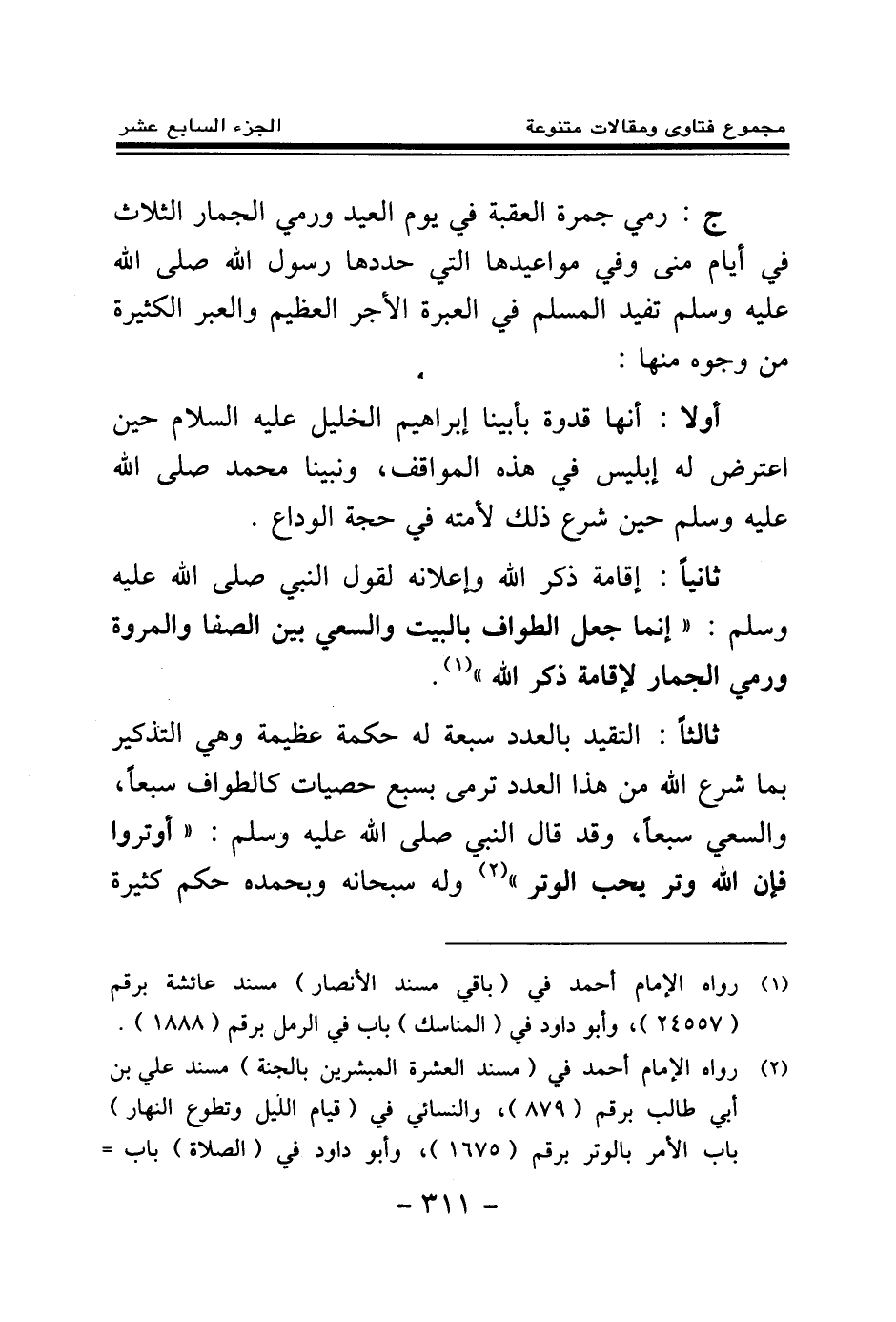 ثالثا: التقيد بالعدد سبعة له حكمة عظيمة وهي التذكير بما شرع الله من هذا العدد ترمي بسبع حصيات كالطواف سبعا، والسعي سبعا، وقد قال النبي صلى الله عليه وسلم: «أوتروا فإن الله وتر يحب الوتر (¬2) » وله سبحانه وبحمده حكم كثيرة