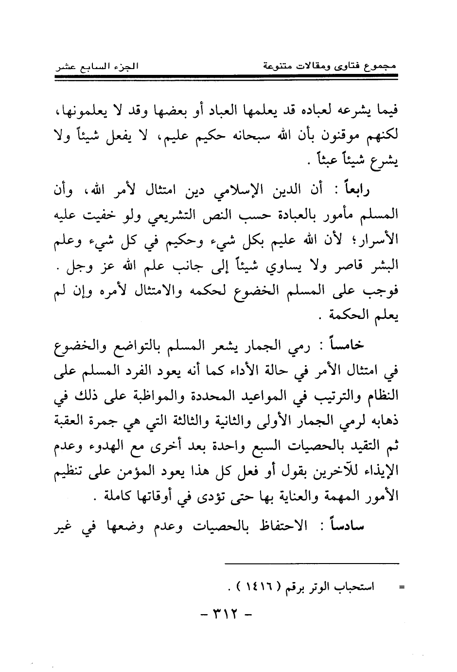رابعا: أن الدين الإسلامي دين امتثال لأمر الله، وأن المسلم مأمور بالعبادة حسب النص التشريعي ولو خفيت عليه الأسرار؛ لأن الله عليم بكل شيء، وحكيم في كل شيء وعلم البشر قاصر ولا يساوي شيئا إلى جانب علم الله عز وجل. فوجب على المسلم الخضوع لحكمه والامتثال لأمره وإن لم يعلم الحكمة.