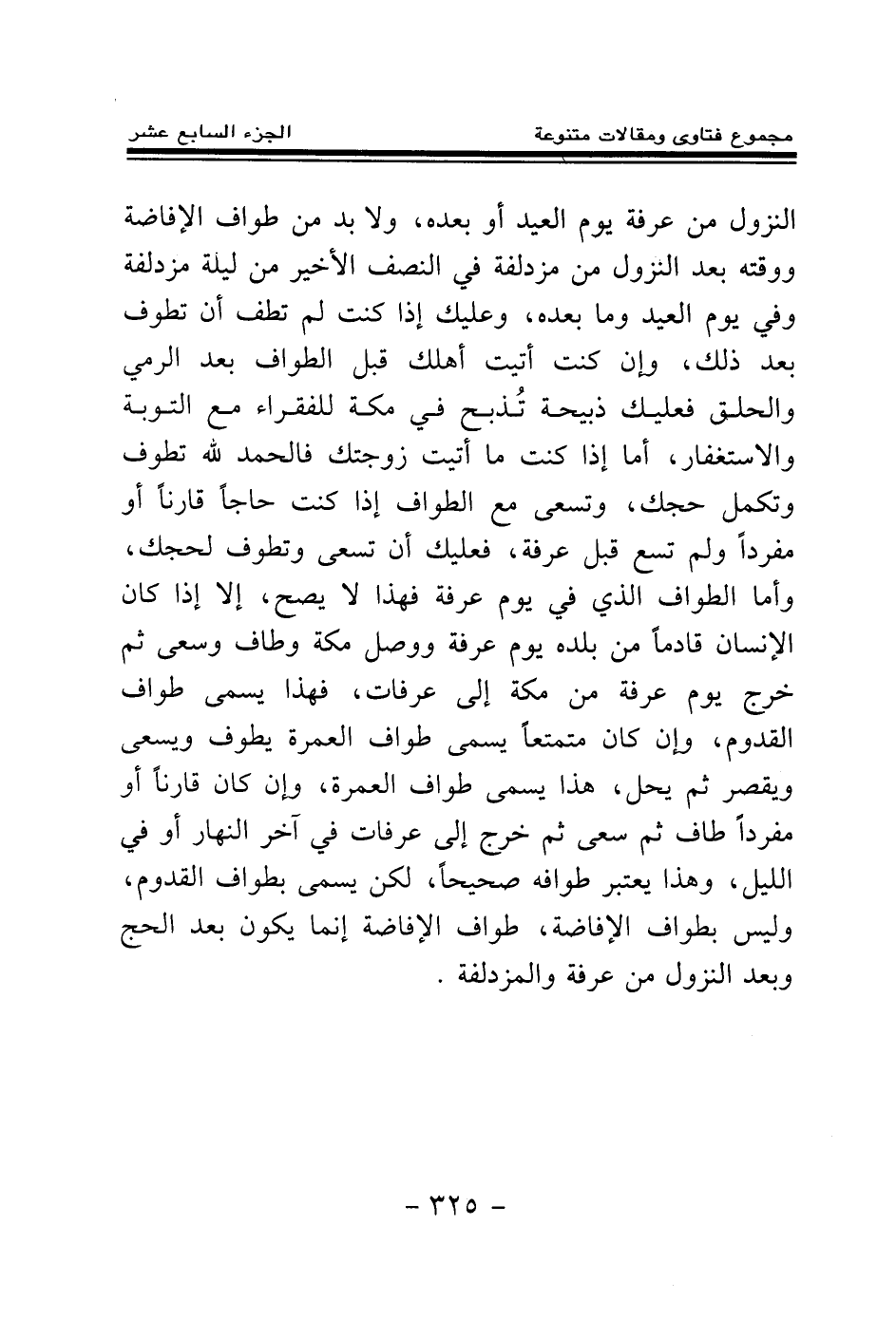 النزول من عرفة يوم العيد أو بعده، ولا بد من طواف الإفاضة ووقته بعد النزول من مزدلفة في النصف الأخير من ليلة مزدلفة وفي يوم العيد وما بعده، وعليك إذا كنت لم تطف أن تطوف بعد ذلك، وإن كنت أتيت أهلك قبل الطواف بعد الرمي والحلق فعليك ذبيحة تذبح في مكة للفقراء مع التوبة والاستغفار، أما إذا كنت ما أتيت زوجتك فالحمد لله تطوف وتكمل حجك، وتسعى مع الطواف إذا كنت حاجا قارنا أو مفردا ولم تسع قبل عرفة، فعليك أن تسعى وتطوف لحجك، وأما الطواف الذي في يوم عرفة فهذا لا يصح، إلا إذا كان الإنسان قادما من بلده يوم عرفة ووصل مكة وطاف وسعى، ثم خرج يوم عرفة من مكة إلى عرفات، فهذا يسمى طواف القدوم، وإن كان متمتعا يسمى طواف العمرة يطوف ويسعى ويقصر ثم يحل، هذا يسمى طواف العمرة، وإن كان قارنا أو مفردا طاف ثم سعى ثم خرج إلى عرفات في آخر النهار أو في الليل، وهذا يعتبر طوافه صحيحا، لكن يسمى بطواف القدوم، وليس بطواف الإفاضة، طواف الإفاضة إنما يكون بعد الحج وبعد النزول من عرفة والمزدلفة.