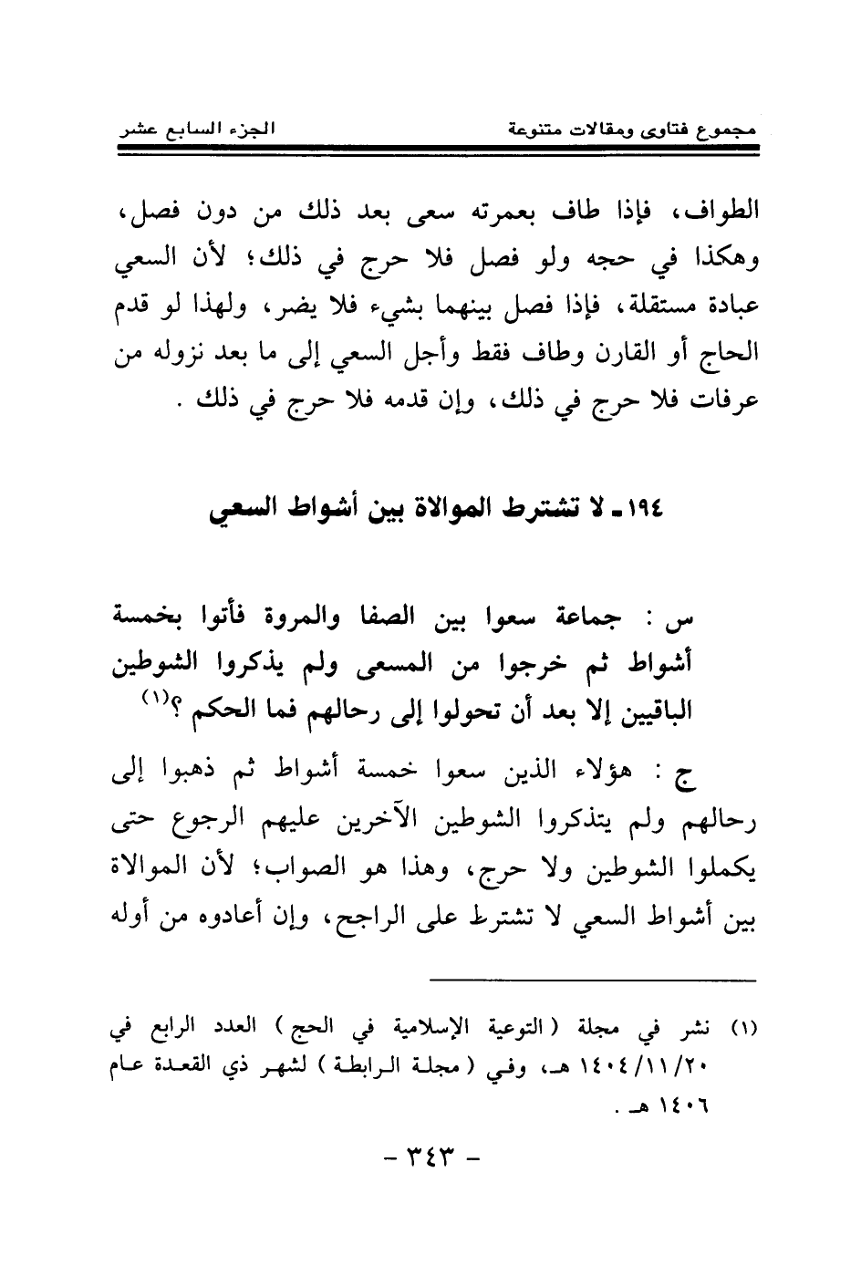 194 - لا تشترط الموالاة بين أشواط السعي