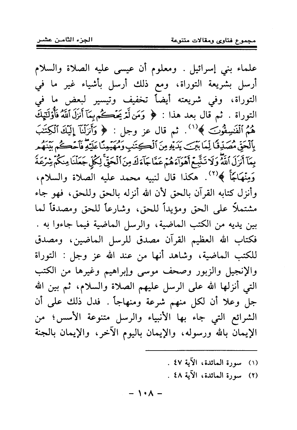 علماء بني إسرائيل ومعلوم أن عيسى عليه الصلاة والسلام أرسل بشريعة التوراة، ومع ذلك أرسل بأشياء غير ما في التوراة. . وفي شريعته أيضا تخفيف وتيسير لبعض ما في التوراة، ثم قال بعد هذا: {وَمَنْ لَمْ يَحْكُمْ بِمَا أَنْزَلَ اللَّهُ فَأُولَئِكَ هُمُ الْفَاسِقُونَ} (¬1) ثم قال عز وجل: {وَأَنْزَلْنَا إِلَيْكَ الْكِتَابَ بِالْحَقِّ مُصَدِّقًا لِمَا بَيْنَ يَدَيْهِ مِنَ الْكِتَابِ وَمُهَيْمِنًا عَلَيْهِ فَاحْكُمْ بَيْنَهُمْ بِمَا أَنْزَلَ اللَّهُ وَلَا تَتَّبِعْ أَهْوَاءَهُمْ عَمَّا جَاءَكَ مِنَ الْحَقِّ لِكُلٍّ جَعَلْنَا مِنْكُمْ شِرْعَةً وَمِنْهَاجًا} (¬2)