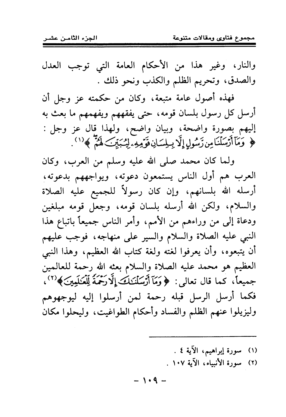 فهذه أصول عامة متبعة، وكان من حكمته عز وجل أن أرسل كل رسول بلسان قومه، حتى يفقههم ويفهمهم، ما بعث به إليهم بصورة واضحة، وبيان واضح، ولهذا قال عز وجل: {وَمَا أَرْسَلْنَا مِنْ رَسُولٍ إِلَّا بِلِسَانِ قَوْمِهِ لِيُبَيِّنَ لَهُمْ} (¬1) الآية.