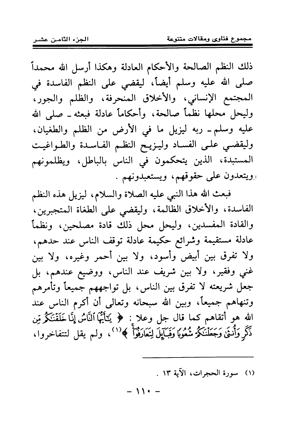 فبعث الله هذا النبي عليه الصلاة والسلام، ليزيل هذه النظم الفاسدة، والأخلاق الظالمة، وليقضي على الطغاة المتجبرين، والقادة المفسدين، وليحل محل ذلك قادة مصلحين، ونظما عادلة مستقيمة، وشرائع حكيمة عادلة، توقف الناس عند حدهم، ولا تفرق بين أبيض وأسود، ولا بين أحمر وغيره، ولا بين غني وففير، ولا بين شريف عند الناس، ووضيع عندهم، بل جعل شريعته لا تفرق بين الناس، بل توجههم جميعا وتأمرهم وتنهاهم جميعا، وبين الله سبحانه وتعالى أن أكرم الناس عند الله هو أتقاهم، كما قال جل وعلا: {يَا أَيُّهَا النَّاسُ إِنَّا خَلَقْنَاكُمْ مِنْ ذَكَرٍ وَأُنْثَى وَجَعَلْنَاكُمْ شُعُوبًا وَقَبَائِلَ لِتَعَارَفُوا} (¬1) ولم يقل لتتفاخروا