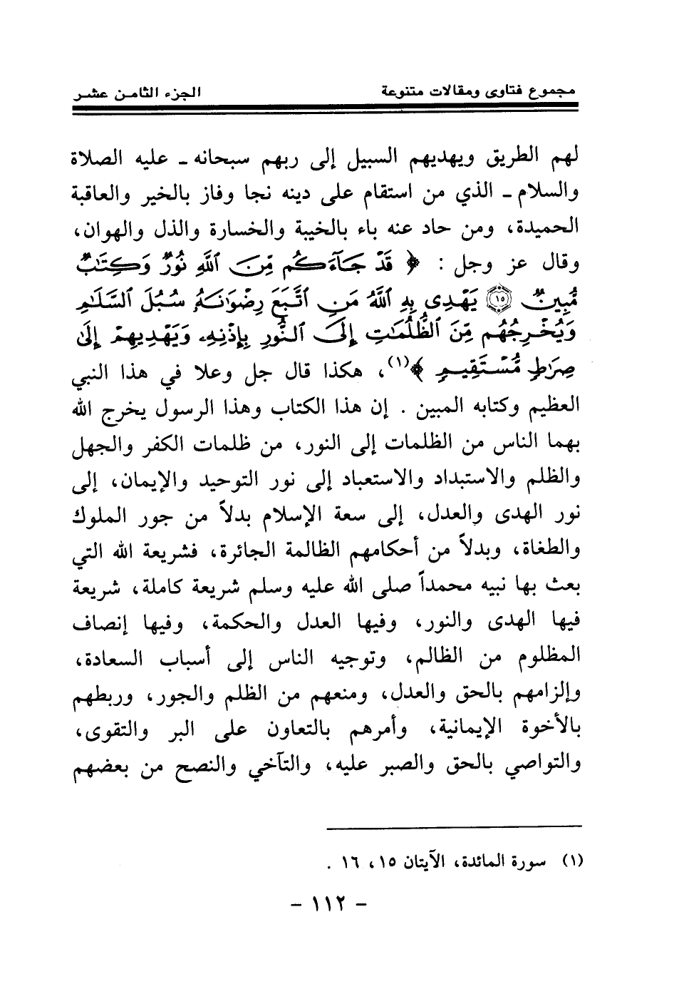 إن هذا الكتاب وهذا الرسول يخرج الله بهما الناس من الظلمات إلى النور من ظلمات الكفر والجهل والظلم والاستبداد والاستعباد إلى نور التوحيد والإيمان، إلى نور الهدى والعدل، إلى سعة الإسلام بدلا من جور الملوك والطغاة، وبدلا من أحكامهم الظالمة الجائرة، فشريعة الله التي بعث بها نبيه محمدا - صلى الله عليه وسلم - شريعة كاملة، شريعة فيها الهدى والنور، وفيها العدل والحكمة، وفيها إنصاف المظلوم من الظالم، وتوجيه الناس إلى أسباب السعادة، وإلزامهم بالحق والعدل، ومنعهم من الظلم والجور، وربطهم بالأخوة الإيمانية، وأمرهم بالتعاون على البر والتقوى، والتواصي بالحق والصبر عليه والتآخي، والنصح من بعضهم