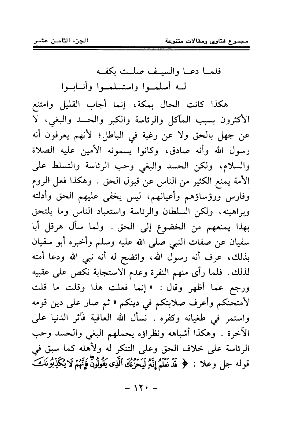 وهكذا فعل الروم وفارس ورؤساؤهم وأعيانهم ليس يخفى عليهم الحق وأدلته وبراهينه، ولكن السلطان والرئاسة واستعباد الناس وما يلتحق بهذا يمنعهم من الخضوع إلى الحق، ولما سأل هرقل أبا سفيان عن صفات النبي صلى الله عليه وسلم وأخبره أبو سفيان بذلك عرف أنه رسول الله واتضح له أنه نبي الله ودعا أمته لذلك، فلما رأى منهم النفرة وعدم الاستجابة نكس على عقبيه ورجع عما أظهر وقال: " إنما فعلت هذا وقلت ما قلت لأمتحنكم وأعرف صلابتكم في دينكم " ثم استمر على دين قومه وطغيانه وكفره. نسأل الله العافية، فآثر الدنيا على الآخرة. وهكذا أشباهه ونظراؤه يحملهم البغي والحسد وحب الرئاسة على خلاف الحق وعلى التنكر له ولأهله كما سبق في قوله جل وعلا: {قَدْ نَعْلَمُ إِنَّهُ لَيَحْزُنُكَ الَّذِي يَقُولُونَ فَإِنَّهُمْ لَا يُكَذِّبُونَكَ وَلَكِنَّ الظَّالِمِينَ بِآيَاتِ اللَّهِ يَجْحَدُونَ} (¬1)