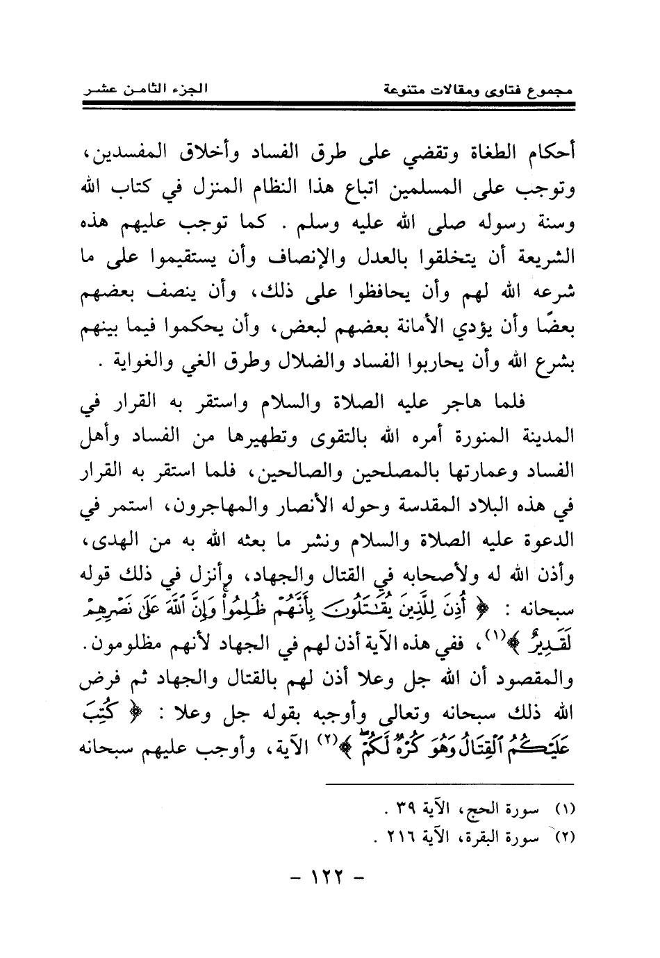 فلما هاجر عليه الصلاة والسلام واستقر به القرار في المدينة المنورة أمره الله بالتقوى وتطهيرها من الفساد وأهل الفساد وعمارتها بالمصلحين والصالحين، فلما استقر به القرار في هذه البلاد المقدسة وحوله الأنصار والمهاجرون، استمر في الدعوة عليه الصلاة والسلام ونشر ما بعثه الله به من الهدى، وأذن الله له ولأصحابه في القتال والجهاد، وأنزل في ذلك قوله سبحانه: {أُذِنَ لِلَّذِينَ يُقَاتَلُونَ بِأَنَّهُمْ ظُلِمُوا وَإِنَّ اللَّهَ عَلَى نَصْرِهِمْ لَقَدِيرٌ} (¬1) ففي هذه الآية أذن لهم في الجهاد لأنهم مظلومون، والمقصود أن الله جل وعلا أذن لهم بالقتال والجهاد، ثم فرض الله ذلك سبحانه وتعالى وأوجبه بقوله جل وعلا: {كُتِبَ عَلَيْكُمُ الْقِتَالُ وَهُوَ كُرْهٌ لَكُمْ} (¬2) الآية، وأوجب عليهم سبحانه