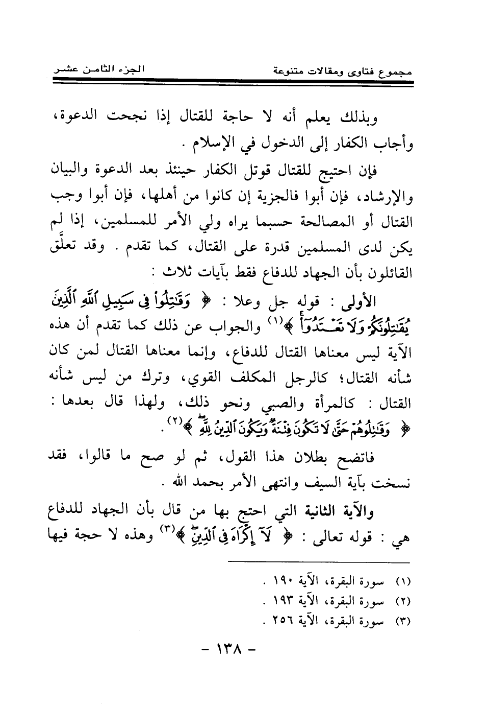 والآية الثانية التي احتج بها من قال بأن الجهاد للدفاع هي قوله تعالى: {لَا إِكْرَاهَ فِي الدِّينِ} (¬3) وهذه لا حجة فيها