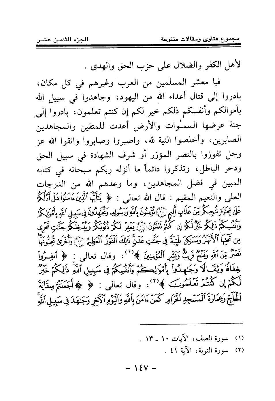 {أَجَعَلْتُمْ سِقَايَةَ الْحَاجِّ وَعِمَارَةَ الْمَسْجِدِ الْحَرَامِ كَمَنْ آمَنَ بِاللَّهِ وَالْيَوْمِ الْآخِرِ وَجَاهَدَ فِي سَبِيلِ اللَّهِ لَا يَسْتَوُونَ عِنْدَ اللَّهِ وَاللَّهُ لَا يَهْدِي الْقَوْمَ الظَّالِمِينَ} (¬1) {الَّذِينَ آمَنُوا وَهَاجَرُوا وَجَاهَدُوا فِي سَبِيلِ اللَّهِ بِأَمْوَالِهِمْ وَأَنْفُسِهِمْ أَعْظَمُ دَرَجَةً عِنْدَ اللَّهِ وَأُولَئِكَ هُمُ الْفَائِزُونَ} (¬2) {يُبَشِّرُهُمْ رَبُّهُمْ بِرَحْمَةٍ مِنْهُ وَرِضْوَانٍ وَجَنَّاتٍ لَهُمْ فِيهَا نَعِيمٌ مُقِيمٌ} (¬3) {خَالِدِينَ فِيهَا أَبَدًا إِنَّ اللَّهَ عِنْدَهُ أَجْرٌ عَظِيمٌ} (¬4) وقال تعالى: {يَا أَيُّهَا الَّذِينَ آمَنُوا قَاتِلُوا الَّذِينَ يَلُونَكُمْ مِنَ الْكُفَّارِ وَلْيَجِدُوا فِيكُمْ غِلْظَةً وَاعْلَمُوا أَنَّ اللَّهَ مَعَ الْمُتَّقِينَ} (¬5)