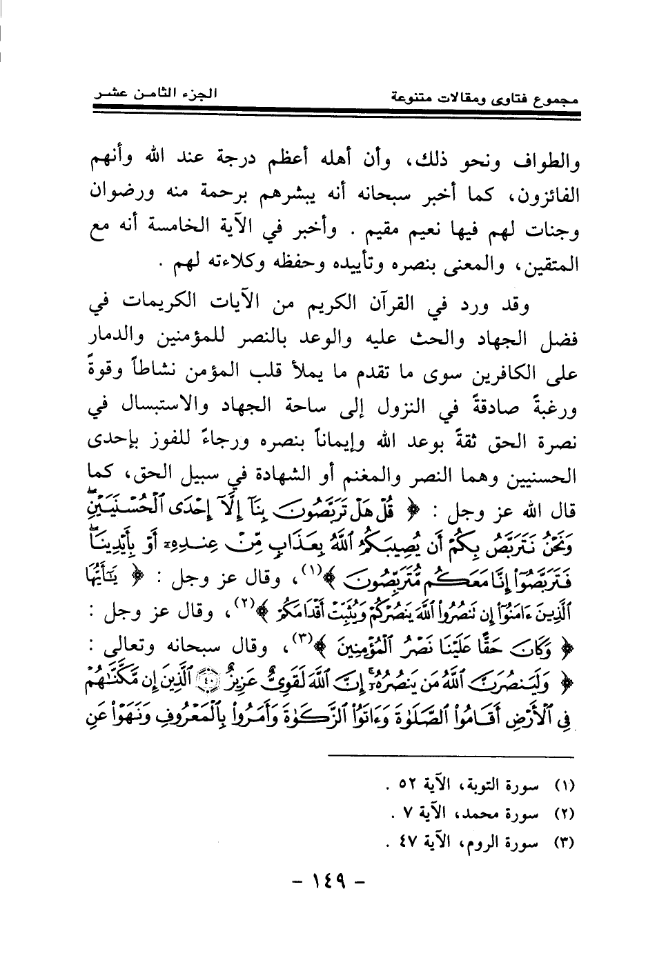 وقد ورد في القرآن الكريم من الآيات الكريمات في فضل الجهاد والحث عليه والوعد بالنصر للمؤمنين والدمار على الكافرين، سوى ما تقدم ما يملأ قلب المؤمن نشاطا وقوة ورغبة صادقة في النزول إلى ساحة الجهاد والاستبسال في نصرة الحق ثقة بوعد الله وإيمانا بنصره ورجاء للفوز بإحدى الحسنيين، وهما: النصر والمغنم، أو الشهادة في سبيل الحق، كما قال الله عز وجل: {قُلْ هَلْ تَرَبَّصُونَ بِنَا إِلَّا إِحْدَى الْحُسْنَيَيْنِ وَنَحْنُ نَتَرَبَّصُ بِكُمْ أَنْ يُصِيبَكُمُ اللَّهُ بِعَذَابٍ مِنْ عِنْدِهِ أَوْ بِأَيْدِينَا فَتَرَبَّصُوا إِنَّا مَعَكُمْ مُتَرَبِّصُونَ} (¬1) وقال عز وجل: {يَا أَيُّهَا الَّذِينَ آمَنُوا إِنْ تَنْصُرُوا اللَّهَ يَنْصُرْكُمْ وَيُثَبِّتْ أَقْدَامَكُمْ} (¬2) وقال عز وجل: {وَكَانَ حَقًّا عَلَيْنَا نَصْرُ الْمُؤْمِنِينَ} (¬3) وقال سبحانه وتعالى: {وَلَيَنْصُرَنَّ اللَّهُ مَنْ يَنْصُرُهُ إِنَّ اللَّهَ لَقَوِيٌّ عَزِيزٌ} (¬4) {الَّذِينَ إِنْ مَكَّنَّاهُمْ فِي الْأَرْضِ أَقَامُوا الصَّلَاةَ وَآتَوُا الزَّكَاةَ وَأَمَرُوا بِالْمَعْرُوفِ وَنَهَوْا عَنِ الْمُنْكَرِ} (¬5)