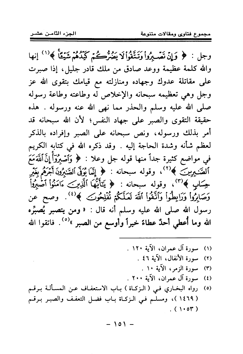 وجل: {وَإِنْ تَصْبِرُوا وَتَتَّقُوا لَا يَضُرُّكُمْ كَيْدُهُمْ شَيْئًا} (¬1) إنها والله كلمة عظيمة ووعد صادق من ملك قادر جليل، إذا صبرت على مقاتلة عدوك وجهاده ومنازلته مع قيامك بتقوى الله عز وجل وهي: تعظيمه سبحانه والإخلاص له وطاعته وطاعة رسوله - صلى الله عليه وسلم - والحذر مما نهى الله عنه ورسوله، هذه حقيقة التقوى والصبر على جهاد النفس؛ لأن الله سبحانه قد أمر بذلك ورسوله.