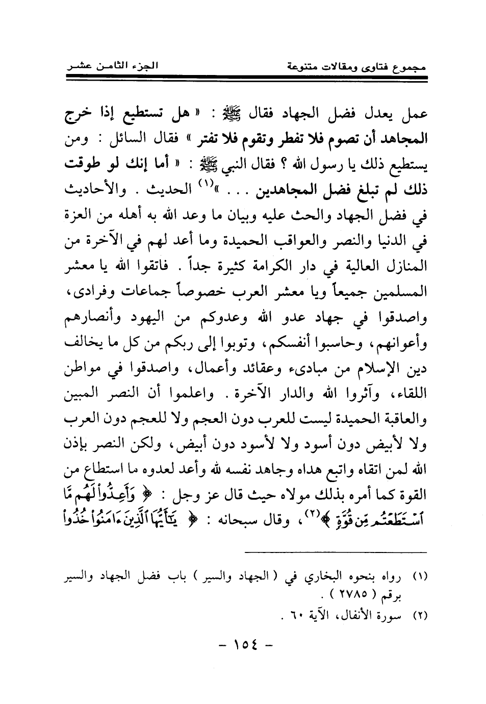 عمل يعدل فضل الجهاد فقال - صلى الله عليه وسلم -: «هل تستطيع إذا خرج المجاهد أن تصوم فلا تفطر وتقوم فلا تفتر، فقال السائل: ومن يستطيع ذلك يا رسول الله؟ فقال النبي - صلى الله عليه وسلم - أما إنك لو طوقت ذلك لم تبلغ فضل المجاهدين (¬1) » الحديث.