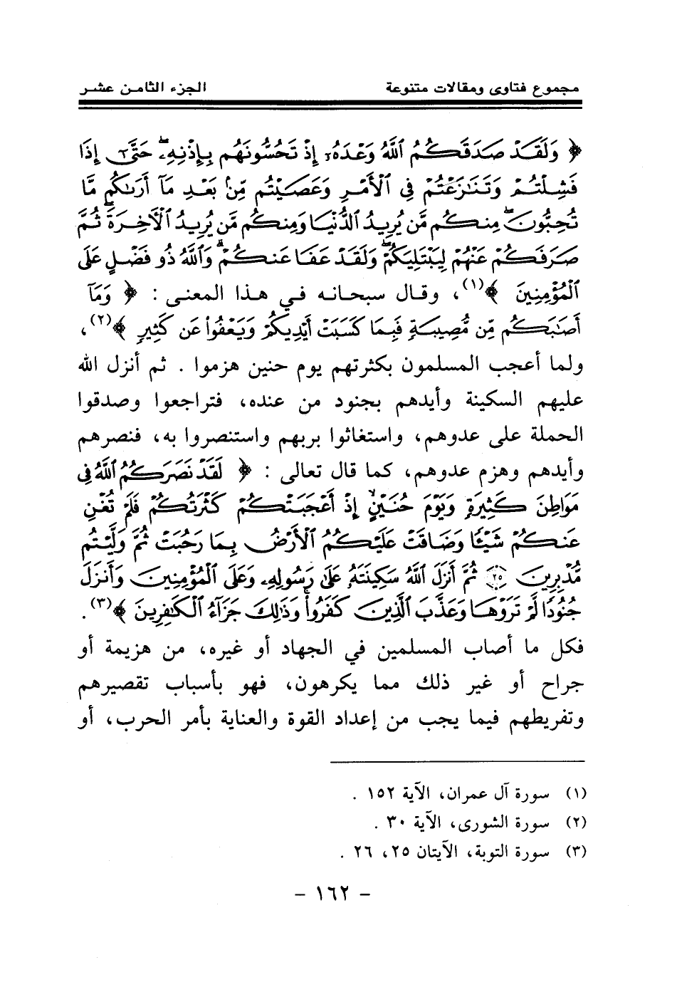 وقال سبحانه في هذا المعنى: {وَمَا أَصَابَكُمْ مِنْ مُصِيبَةٍ فَبِمَا كَسَبَتْ أَيْدِيكُمْ وَيَعْفُو عَنْ كَثِيرٍ} (¬2) ولما أعجب المسلمون بكثرتهم يوم حنين هزموا ثم أنزل الله عليهم السكينة وأيدهم بجنود من عنده فتراجعوا وصدقوا الحملة على عدوهم واستغاثوا بربهم واستنصروا به، فنصرهم وأيدهم وهزم عدوهم، كما قال تعالى: {لَقَدْ نَصَرَكُمُ اللَّهُ فِي مَوَاطِنَ كَثِيرَةٍ وَيَوْمَ حُنَيْنٍ إِذْ أَعْجَبَتْكُمْ كَثْرَتُكُمْ فَلَمْ تُغْنِ عَنْكُمْ شَيْئًا وَضَاقَتْ عَلَيْكُمُ الْأَرْضُ بِمَا رَحُبَتْ ثُمَّ وَلَّيْتُمْ مُدْبِرِينَ} (¬3) {ثُمَّ أَنْزَلَ اللَّهُ سَكِينَتَهُ عَلَى رَسُولِهِ وَعَلَى الْمُؤْمِنِينَ وَأَنْزَلَ جُنُودًا لَمْ تَرَوْهَا وَعَذَّبَ الَّذِينَ كَفَرُوا وَذَلِكَ جَزَاءُ الْكَافِرِينَ} (¬4)