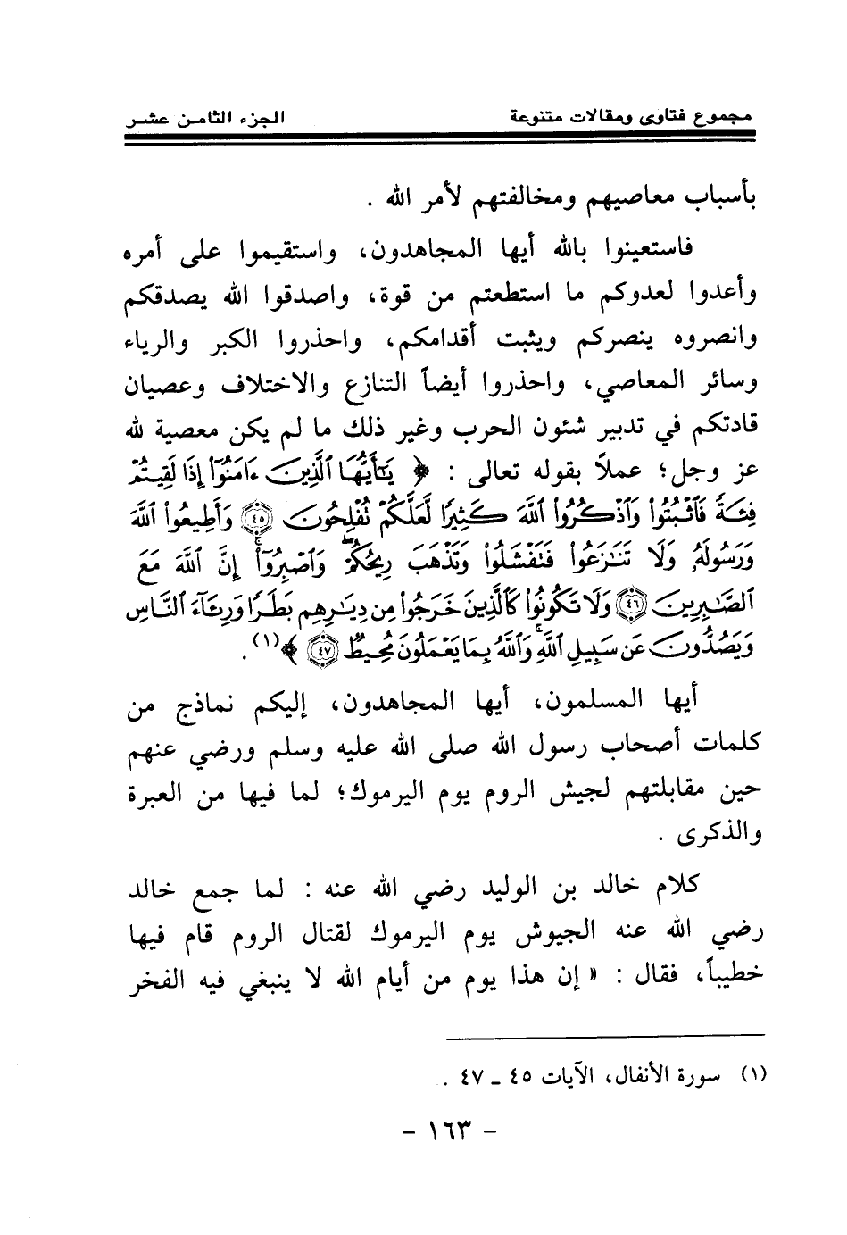 فاستعينوا بالله أيها المجاهدون واستقيموا على أمره وأعدوا لعدوكم ما استطعتم من قوة، واصدقوا الله يصدقكم وانصروه ينصركم ويثبت أقدامكم، واحذروا الكبر والرياء وسائر المعاصي، واحذروا أيضا التنازع والاختلاف وعصيان قادتكم في تدبير شئون الحرب وغير ذلك ما لم يكن معصية لله عز وجل عملا بقوله تعالى: {يَا أَيُّهَا الَّذِينَ آمَنُوا إِذَا لَقِيتُمْ فِئَةً فَاثْبُتُوا وَاذْكُرُوا اللَّهَ كَثِيرًا لَعَلَّكُمْ تُفْلِحُونَ} (¬1) {وَأَطِيعُوا اللَّهَ وَرَسُولَهُ وَلَا تَنَازَعُوا فَتَفْشَلُوا وَتَذْهَبَ رِيحُكُمْ وَاصْبِرُوا إِنَّ اللَّهَ مَعَ الصَّابِرِينَ} (¬2) {وَلَا تَكُونُوا كَالَّذِينَ خَرَجُوا مِنْ دِيَارِهِمْ بَطَرًا وَرِئَاءَ النَّاسِ وَيَصُدُّونَ عَنْ سَبِيلِ اللَّهِ وَاللَّهُ بِمَا يَعْمَلُونَ مُحِيطٌ} (¬3)