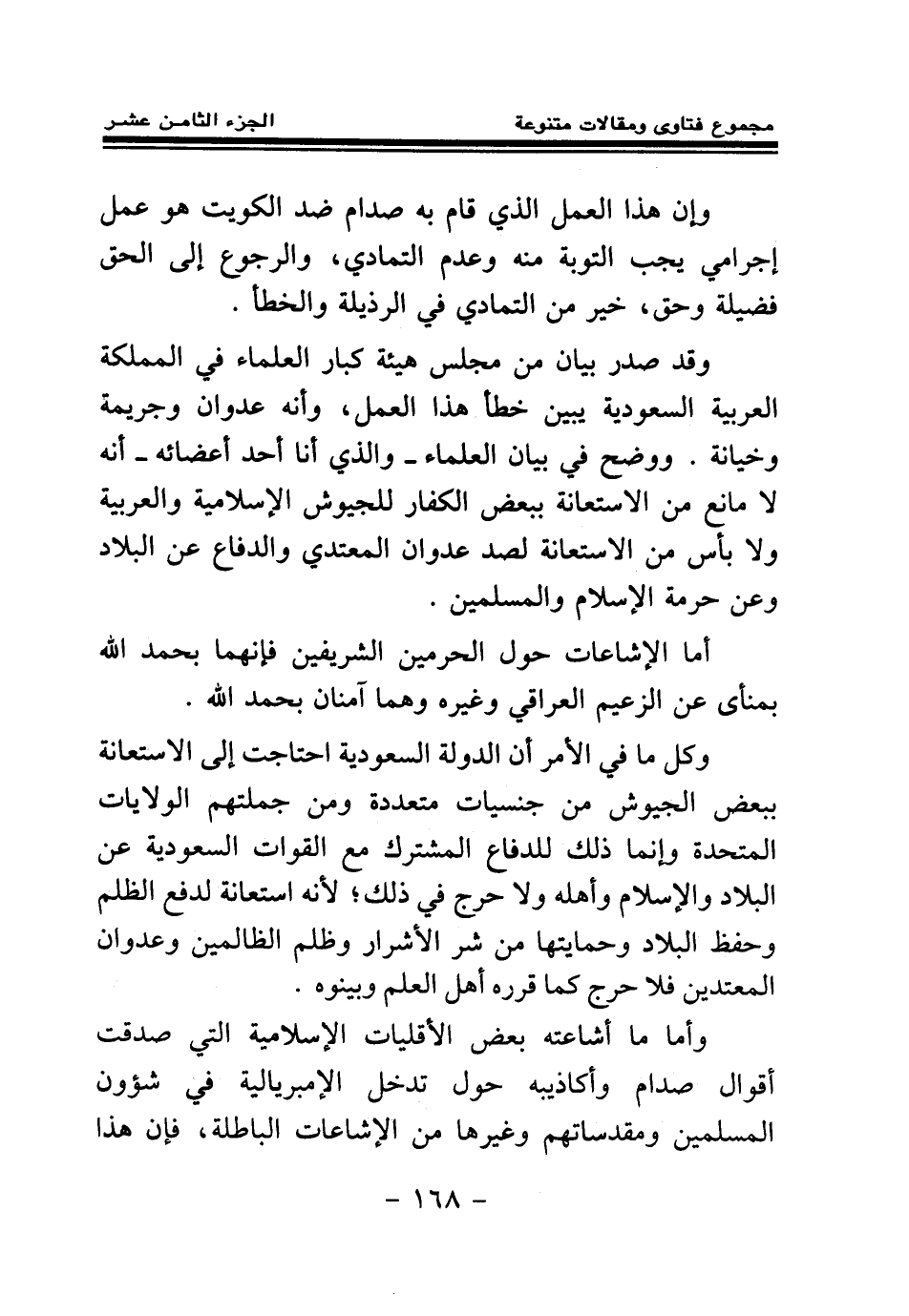 وقد صدر بيان من مجلس هيئة كبار العلماء في المملكة العربية السعودية يبين خطأ هذا العمل، وأنه عدوان وجريمة وخيانة. ووضح في بيان العلماء- والذي أنا أحد أعضائه- أنه لا مانع من الاستعانة ببعض الكفار للجيوش الإسلامية والعربية، ولا بأس من الاستعانة لصد عدوان المعتدي والدفاع عن البلاد وعن حرمة الإسلام والمسلمين.