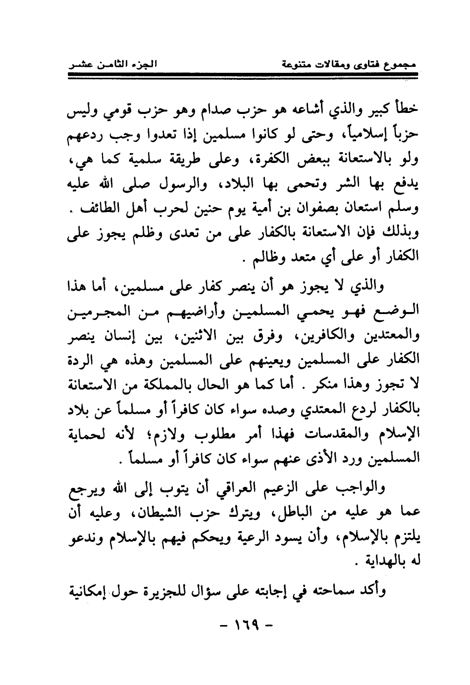 خطأ كبير، والذي أشاعه هو حزب صدام وهو حزب قومي وليس حزبا إسلاميا، وحتى لو كانوا مسلمين إذا تعدوا وجب ردعهم ولو بالاستعانة ببعض الكفرة، وعلى طريقة سلمية كما هي، يدفع بها الشر وتحمى بها البلاد، والرسول - صلى الله عليه وسلم - استعان بصفوان بن أمية يوم حنين لحرب أهل الطائف. وبذلك فإن الاستعانة بالكفار على من تعدى وظلم يجوز على الكفار أو على أي متعد وظالم.