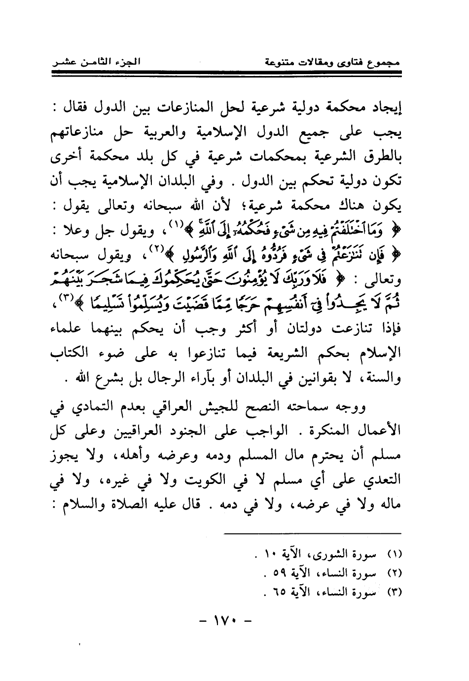 إيجاد محكمة دولية شرعية لحل المنازعات بين الدول، فقال: يجب على جميع الدول الإسلامية والعربية حل منازعاتهم بالطرق الشرعية بمحكمات شرعية في كل بلد محكمة أخرى تكون دولية تحكم بين الدول. وفي البلدان الإسلامية يجب أن يكون هناك محكمة شرعية؛ لأن الله سبحانه وتعالى يقول: {وَمَا اخْتَلَفْتُمْ فِيهِ مِنْ شَيْءٍ فَحُكْمُهُ إِلَى اللَّهِ} (¬1) ويقول جل وعلا: {فَإِنْ تَنَازَعْتُمْ فِي شَيْءٍ فَرُدُّوهُ إِلَى اللَّهِ وَالرَّسُولِ} (¬2) ويقول سبحانه وتعالى: {فَلَا وَرَبِّكَ لَا يُؤْمِنُونَ حَتَّى يُحَكِّمُوكَ فِيمَا شَجَرَ بَيْنَهُمْ ثُمَّ لَا يَجِدُوا فِي أَنْفُسِهِمْ حَرَجًا مِمَّا قَضَيْتَ وَيُسَلِّمُوا تَسْلِيمًا} (¬3) فإذا تنازعت دولتان أو أكثر وجب أن يحكم بينهما علماء الإسلام بحكم الشريعة فيما تنازعوا به على ضوء الكتاب والسنة، لا بقوانين في البلدان أو بآراء الرجال بل بشرع الله.