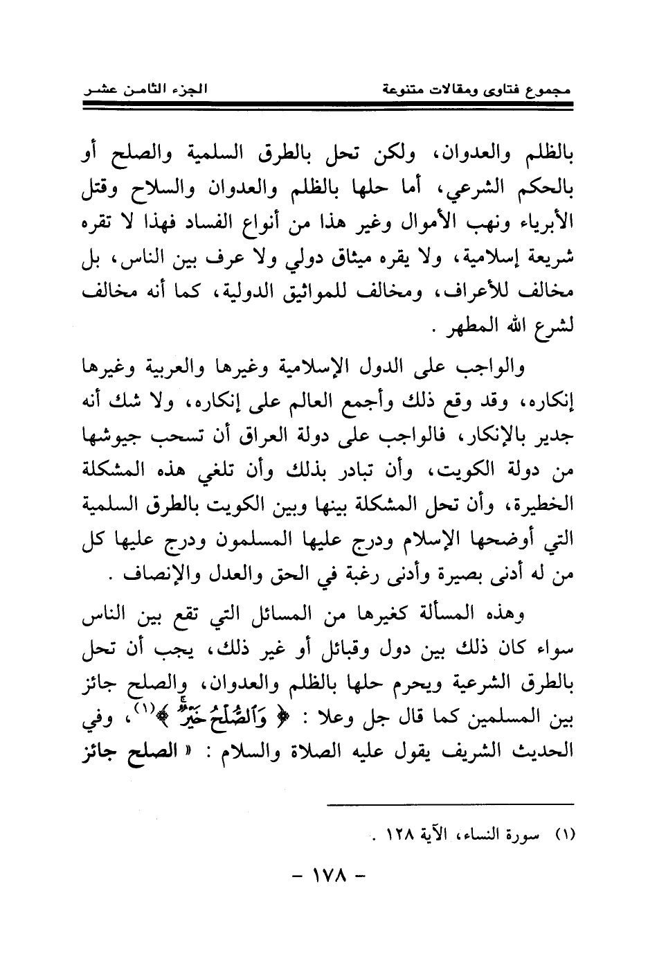 والواجب على الدول الإسلامية وغيرها، والعربية وغيرها، إنكاره، وقد وقع ذلك وأجمع العالم على إنكاره، ولا شك أنه جدير بالإنكار، فالواجب على دولة العراق أن تسحب جيوشها من دولة الكويت، وأن تبادر بذلك، وأن تلغي هذه المشكلة الخطيرة، وأن تحل المشكلة بينها وبين الكويت بالطرق السلمية التي أوضحها الإسلام، ودرج عليها المسلمون، ودرج عليها كل من له أدنى بصيرة وأدنى رغبة في الحق والعدل والإنصاف.