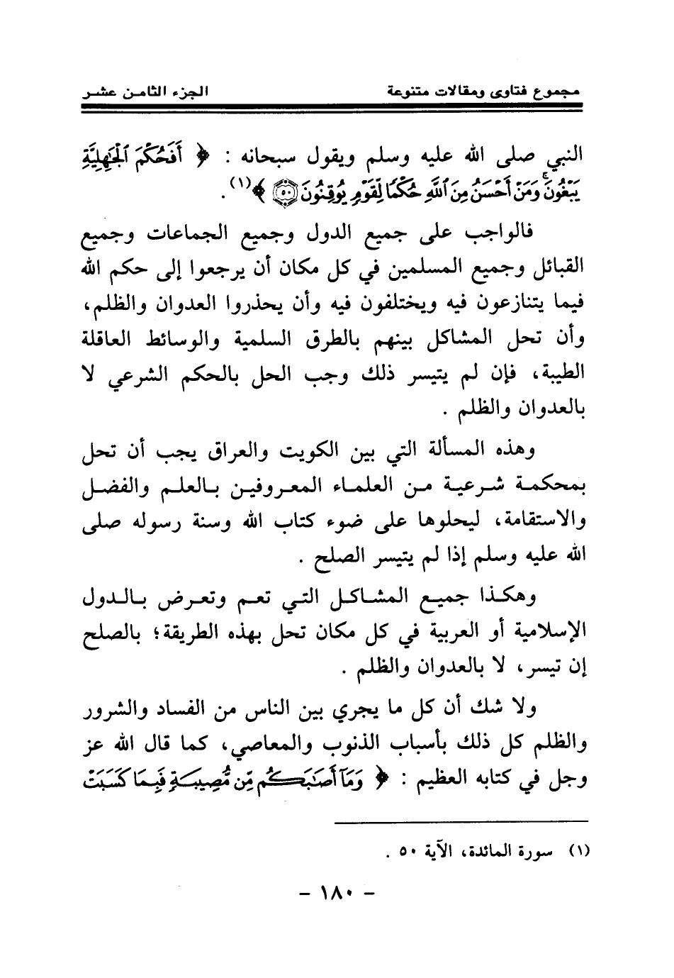 وهذه المسألة التي بين الكويت والعراق يجب أن تحل بمحكمة شرعية من العلماء المعروفين بالعلم والفضل والاستقامة ليحلوها على ضوء كتاب الله وسنة رسوله صلى الله عليه وسلم إذا لم يتيسر الصلح.