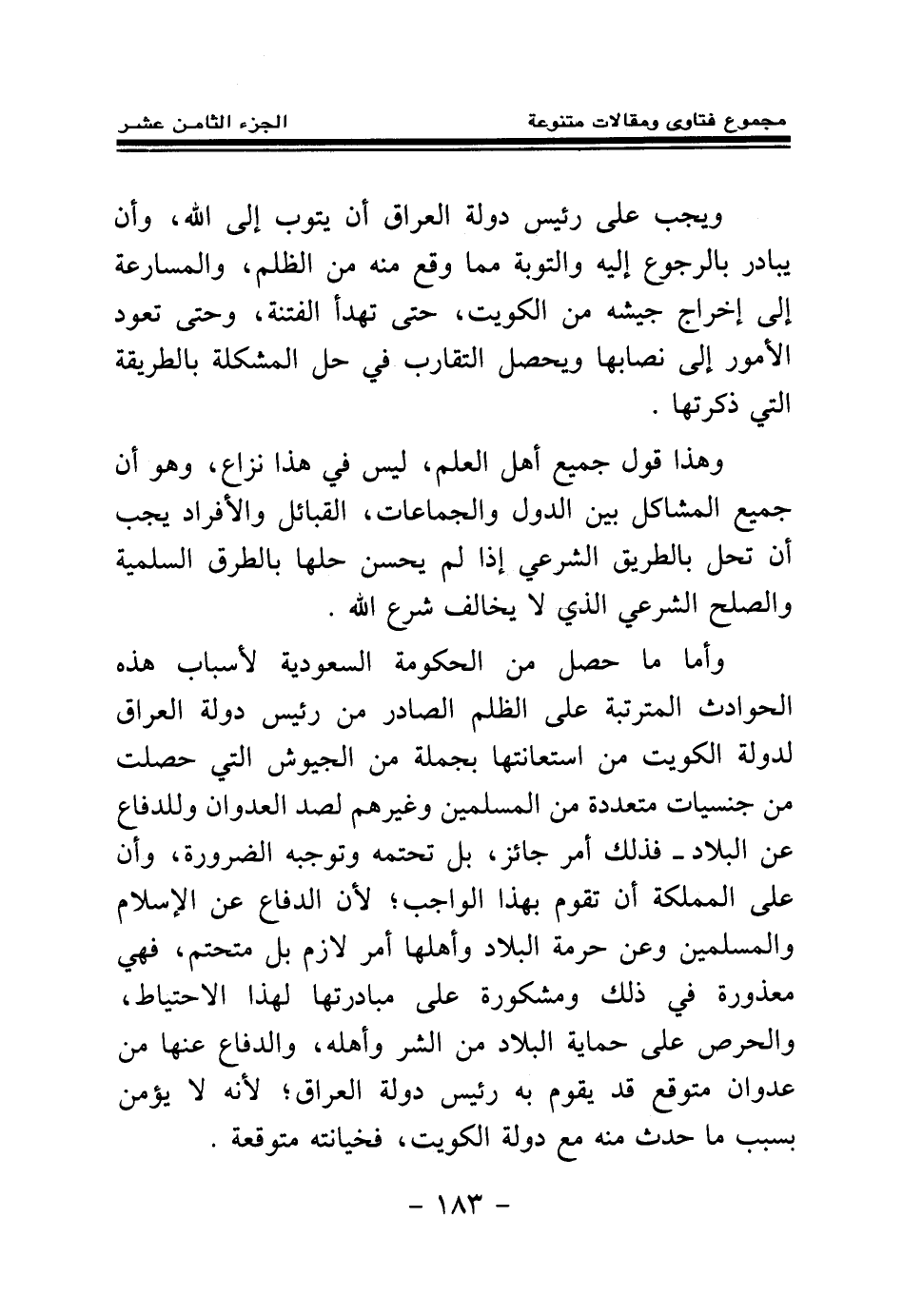 ويجب على رئيس دولة العراق أن يتوب إلى الله وأن يبادر بالرجوع إليه والتوبة بما وقع منه من ظلم والمسارعة إلى إخراج جيشه من الكويت حتى تهدأ الفتنة، وحتى تعود الأمور إلى نصابها، ويحصل التقارب في حل المشكلة بالطريقة التي ذكرتها.