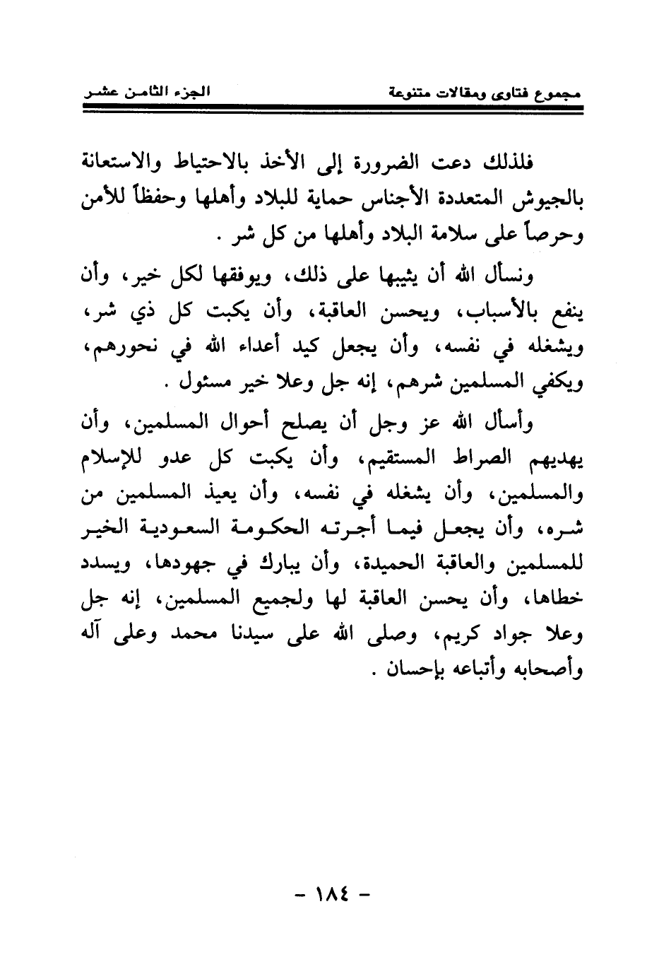 وأسأل الله عز وجل أن يصلح أحوال المسلمين وأن يهديهم الصراط المستقيم وأن يكبت كل عدو للإسلام والمسلمين، وأن يشغله في نفسه وأن يعيذ المسلمين من شره، وأن يجعل فيما أجرته الحكومة السعودية الخير للمسلمين والعاقبة الحميدة، وأن يبارك في جهودها ويسدد خطاها، وأن يحسن العاقبة لها ولجميع المسلمين، إنه جل وعلا جواد كريم، وصلى الله على سيدنا محمد وعلى آله وأصحابه وأتباعه بإحسان.