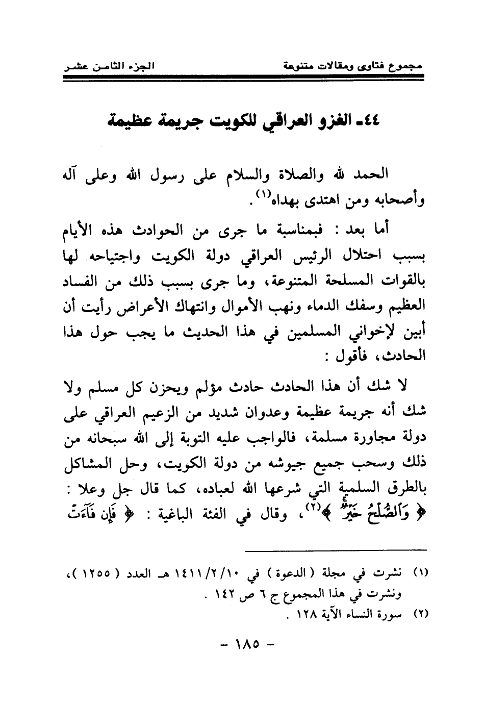لا شك أن هذا الحادث حادث مؤلم، ويحزن كل مسلم، ولا شك أنه جريمة عظيمة وعدوان شديد من الزعيم العراقي على دولة مجاورة مسلمة، فالواجب عليه التوبة إلى الله سبحانه من ذلك، وسحب جميع جيوشه من دولة الكويت، وحل المشاكل بالطرق السلمية التي شرعها الله لعباده، كما قال جل وعلا: {وَالصُّلْحُ خَيْرٌ} (¬2) وقال في الفئة الباغية: