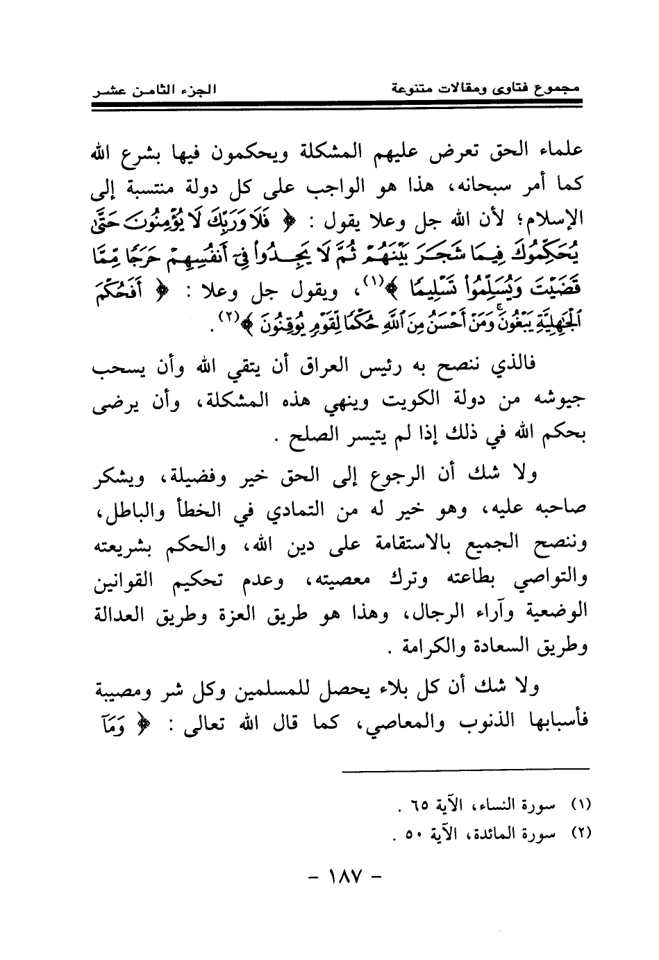 علماء الحق، تعرض عليهم المشكلة ويحكمون فيها بشرع الله كما أمر سبحانه، هذا هو الواجب على كل دولة منتسبة إلى الإسلام؛ لأن الله جل وعلا يقول: {فَلَا وَرَبِّكَ لَا يُؤْمِنُونَ حَتَّى يُحَكِّمُوكَ فِيمَا شَجَرَ بَيْنَهُمْ ثُمَّ لَا يَجِدُوا فِي أَنْفُسِهِمْ حَرَجًا مِمَّا قَضَيْتَ وَيُسَلِّمُوا تَسْلِيمًا} (¬1) ويقول جل وعلا: {أَفَحُكْمَ الْجَاهِلِيَّةِ يَبْغُونَ وَمَنْ أَحْسَنُ مِنَ اللَّهِ حُكْمًا لِقَوْمٍ يُوقِنُونَ} (¬2) فالذي ننصح به رئيس العراق أن يتقي الله وأن يسحب جيوشه من دولة الكويت وينهي هذه المشكلة، وأن يرضى بحكم الله في ذلك إذا لم يتيسر الصلح.