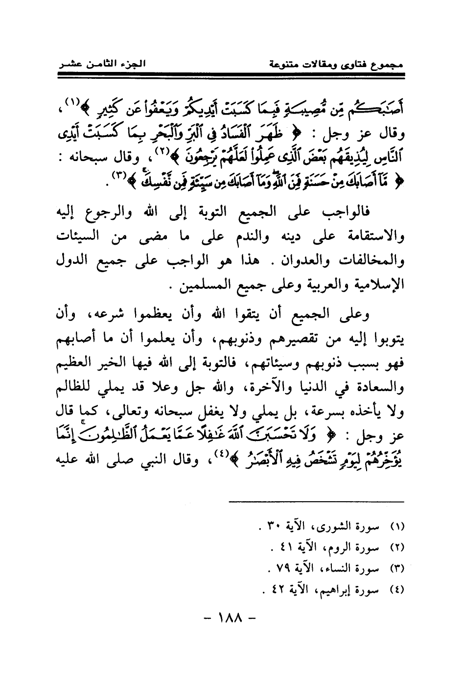 وعلى الجميع أن يتقوا الله وأن يعظموا شرعه، وأن يتوبوا إليه من تقصيرهم وذنوبهم، وأن يعلموا أن ما أصابهم فهو بسبب ذنوبهم وسيئاتهم، فالتوبة إلى الله فيها الخير العظيم والسعادة في الدنيا والآخرة، والله جل وعلا قد يملي للظالم ولا يأخذه بسرعة، بل يملي ولا يغفل سبحانه وتعالى، كما قال عز وجل: {وَلَا تَحْسَبَنَّ اللَّهَ غَافِلًا عَمَّا يَعْمَلُ الظَّالِمُونَ إِنَّمَا يُؤَخِّرُهُمْ لِيَوْمٍ تَشْخَصُ فِيهِ الْأَبْصَارُ} (¬4) وقال النبي - صلى الله عليه