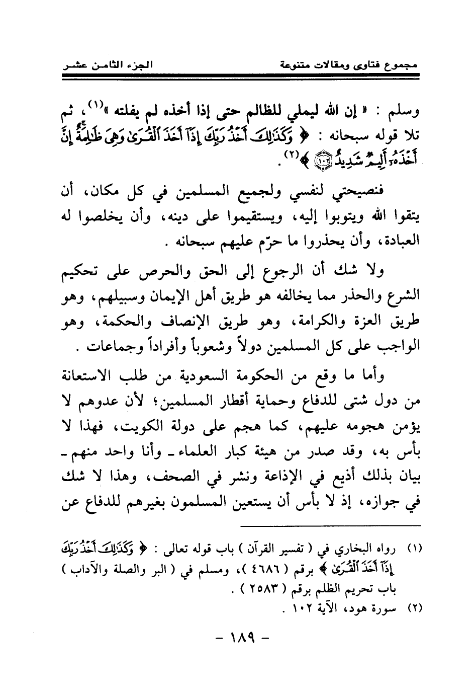 وأما ما وقع من الحكومة السعودية من طلب الاستعانة من دول شتى للدفاع وحماية أقطار المسلمين؛ لأن عدوهم لا يؤمن هجومه عليهم، كما هجم على دولة الكويت - فهذا لا بأس به، وقد صدر من هيئة كبار العلماء- وأنا واحد منهم- بيان بذلك أذيع في الإذاعة ونشر في الصحف، وهذا لا شك في جوازه، إذ لا بأس أن يستعين المسلمون بغيرهم للدفاع عن