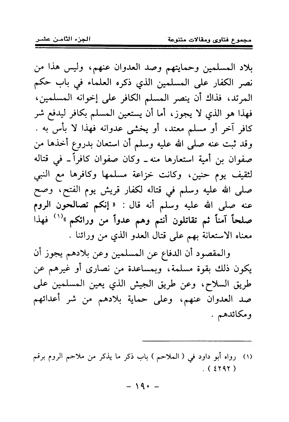 بلاد المسلمين وحمايتهم وصد العدوان عنهم، وليس هذا من نصر الكفار على المسلمين الذي ذكره العلماء في باب حكم المرتد، فذاك أن ينصر المسلم الكافر على إخوانه المسلمين، فهذا هو الذي لا يجوز، أما أن يستعين المسلم بكافر ليدفع شر كافر آخر أو مسلم معتد، أو يخشى عدوانه فهذا لا بأس به.