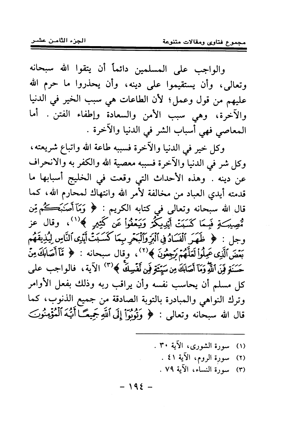 وهذه الأحداث التي وقعت في الخليج أسبابها ما قدمته أيدي العباد من مخالفة لأمر الله وانتهاك لمحارم الله، كما قال الله سبحانه وتعالى في كتابه الكريم: {وَمَا أَصَابَكُمْ مِنْ مُصِيبَةٍ فَبِمَا كَسَبَتْ أَيْدِيكُمْ وَيَعْفُو عَنْ كَثِيرٍ} (¬1) وقال عز وجل: {ظَهَرَ الْفَسَادُ فِي الْبَرِّ وَالْبَحْرِ بِمَا كَسَبَتْ أَيْدِي النَّاسِ لِيُذِيقَهُمْ بَعْضَ الَّذِي عَمِلُوا لَعَلَّهُمْ يَرْجِعُونَ} (¬2) وقال سبحانه: {مَا أَصَابَكَ مِنْ حَسَنَةٍ فَمِنَ اللَّهِ وَمَا أَصَابَكَ مِنْ سَيِّئَةٍ فَمِنْ نَفْسِكَ} (¬3) الآية.