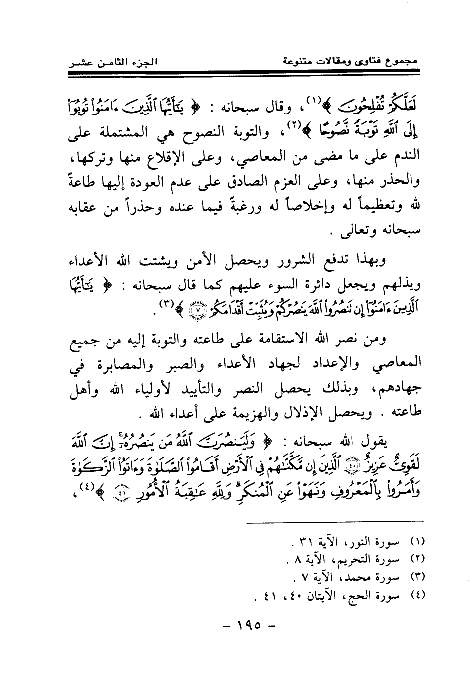 وبهذا تدفع الشرور ويحصل الأمن، ويشتت الله الأعداء ويذلهم ويجعل دائرة السوء عليهم، كما قال سبحانه: {يَا أَيُّهَا الَّذِينَ آمَنُوا إِنْ تَنْصُرُوا اللَّهَ يَنْصُرْكُمْ وَيُثَبِّتْ أَقْدَامَكُمْ} (¬2)