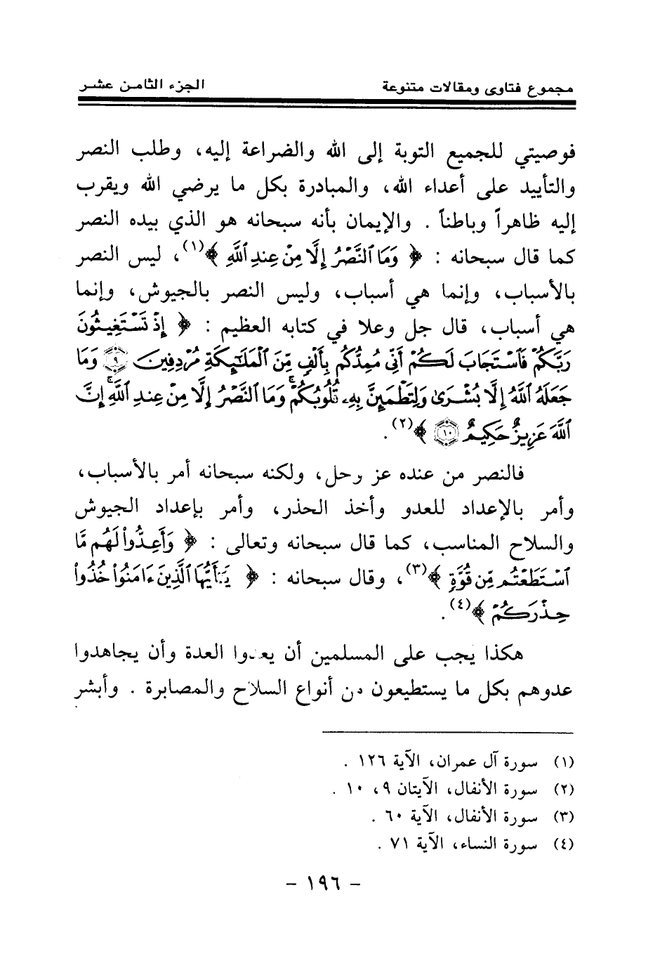 فالنصر من عنده عز وجل، ولكنه سبحانه أمر بالأسباب، وأمر بالإعداد للعدو وأخذ الحذر، وأمر بإعداد الجيوش والسلاح المناسب، كما قال سبحانه وتعالى: {وَأَعِدُّوا لَهُمْ مَا اسْتَطَعْتُمْ مِنْ قُوَّةٍ} (¬4) وقال سبحانه: {يَا أَيُّهَا الَّذِينَ آمَنُوا خُذُوا حِذْرَكُمْ} (¬5)