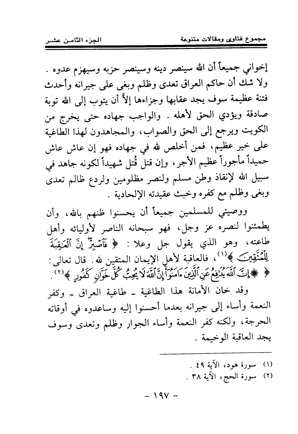 والواجب جهاده حتى يخرج من الكويت ويرجع إلى الحق والصواب، والمجاهدون لهذا الطاغية على خير عظيم، فمن أخلص لله في جهاده فهو إن عاش عاش حميدا مأجورا عظيم الأجر، وإن قتل قتل شهيدا لكونه جاهد في سبيل الله لإنقاذ وطن مسلم ولنصر مظلومين ولردع ظالم تعدى وبغى وظلم مع كفره وخبث عقيدته الإلحادية.