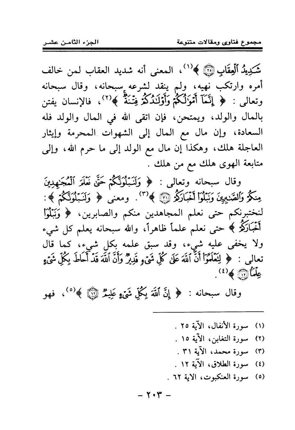 {وَاعْلَمُوا أَنَّ اللَّهَ شَدِيدُ الْعِقَابِ} (¬1) المعنى أنه شديد العقاب لمن خالف أمره وارتكب نهيه ولم ينقد لشرعه سبحانه، وقال سبحانه وتعالى: {إِنَّمَا أَمْوَالُكُمْ وَأَوْلَادُكُمْ فِتْنَةٌ} (¬2) فالإنسان يفتن بالمال والولد ويمتحن، فإن اتقى الله في المال والولد فله السعادة، وإن مال مع المال إلى الشهوات المحرمة وإيثار العاجلة هلك، وهكذا إن مال مع الولد إلى ما حرم الله وإلى متابعة الهوى هلك مع من هلك.