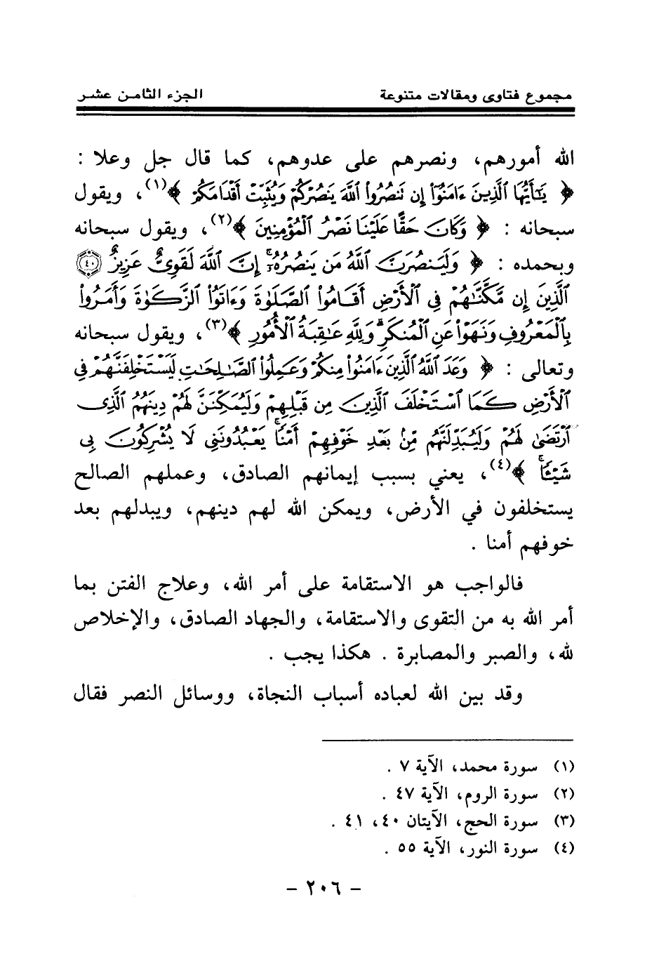 الله أمورهم ونصرهم على عدوهم، كما قال جل وعلا: {يَا أَيُّهَا الَّذِينَ آمَنُوا إِنْ تَنْصُرُوا اللَّهَ يَنْصُرْكُمْ وَيُثَبِّتْ أَقْدَامَكُمْ} (¬1) ويقول سبحانه وتعالى {وَكَانَ حَقًّا عَلَيْنَا نَصْرُ الْمُؤْمِنِينَ} (¬2) ويقول سبحانه وبحمده: {وَلَيَنْصُرَنَّ اللَّهُ مَنْ يَنْصُرُهُ إِنَّ اللَّهَ لَقَوِيٌّ عَزِيزٌ} (¬3) {الَّذِينَ إِنْ مَكَّنَّاهُمْ فِي الْأَرْضِ أَقَامُوا الصَّلَاةَ وَآتَوُا الزَّكَاةَ وَأَمَرُوا بِالْمَعْرُوفِ وَنَهَوْا عَنِ الْمُنْكَرِ وَلِلَّهِ عَاقِبَةُ الْأُمُورِ} (¬4) ويقول سبحانه وتعالى: {وَعَدَ اللَّهُ الَّذِينَ آمَنُوا مِنْكُمْ وَعَمِلُوا الصَّالِحَاتِ لَيَسْتَخْلِفَنَّهُمْ فِي الْأَرْضِ كَمَا اسْتَخْلَفَ الَّذِينَ مِنْ قَبْلِهِمْ وَلَيُمَكِّنَنَّ لَهُمْ دِينَهُمُ الَّذِي ارْتَضَى لَهُمْ وَلَيُبَدِّلَنَّهُمْ مِنْ بَعْدِ خَوْفِهِمْ أَمْنًا يَعْبُدُونَنِي لَا يُشْرِكُونَ بِي شَيْئًا} (¬5) يعني: بسبب إيمانهم الصادق وعملهم الصالح يستخلفون في الأرض، ويمكن الله لهم دينهم، ويبدلهم من بعد خوفهم أمنا.