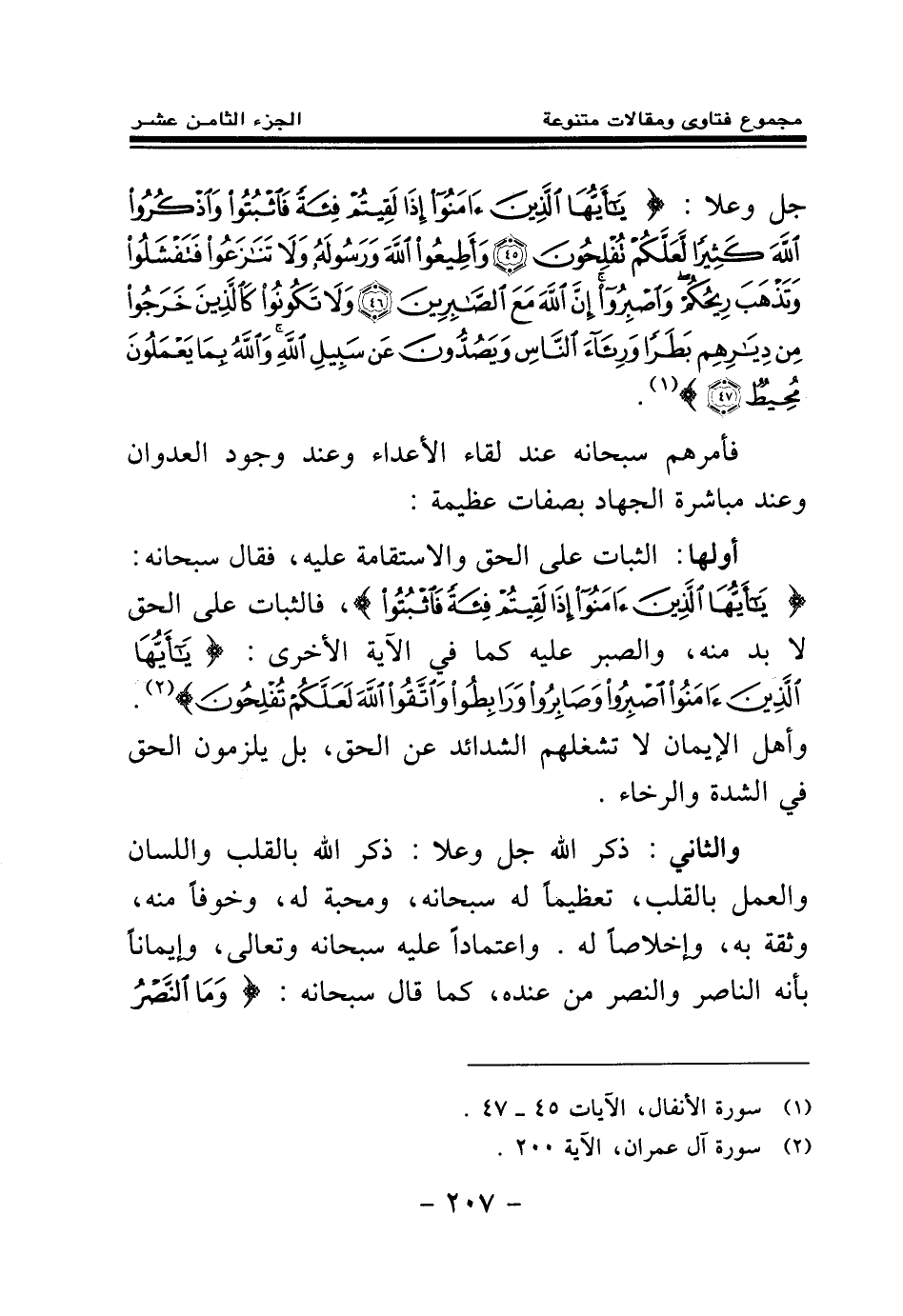 جل وعلا: {يَا أَيُّهَا الَّذِينَ آمَنُوا إِذَا لَقِيتُمْ فِئَةً فَاثْبُتُوا وَاذْكُرُوا اللَّهَ كَثِيرًا لَعَلَّكُمْ تُفْلِحُونَ} (¬1) {وَأَطِيعُوا اللَّهَ وَرَسُولَهُ وَلَا تَنَازَعُوا فَتَفْشَلُوا وَتَذْهَبَ رِيحُكُمْ وَاصْبِرُوا إِنَّ اللَّهَ مَعَ الصَّابِرِينَ} (¬2) {وَلَا تَكُونُوا كَالَّذِينَ خَرَجُوا مِنْ دِيَارِهِمْ بَطَرًا وَرِئَاءَ النَّاسِ وَيَصُدُّونَ عَنْ سَبِيلِ اللَّهِ وَاللَّهُ بِمَا يَعْمَلُونَ مُحِيطٌ} (¬3)